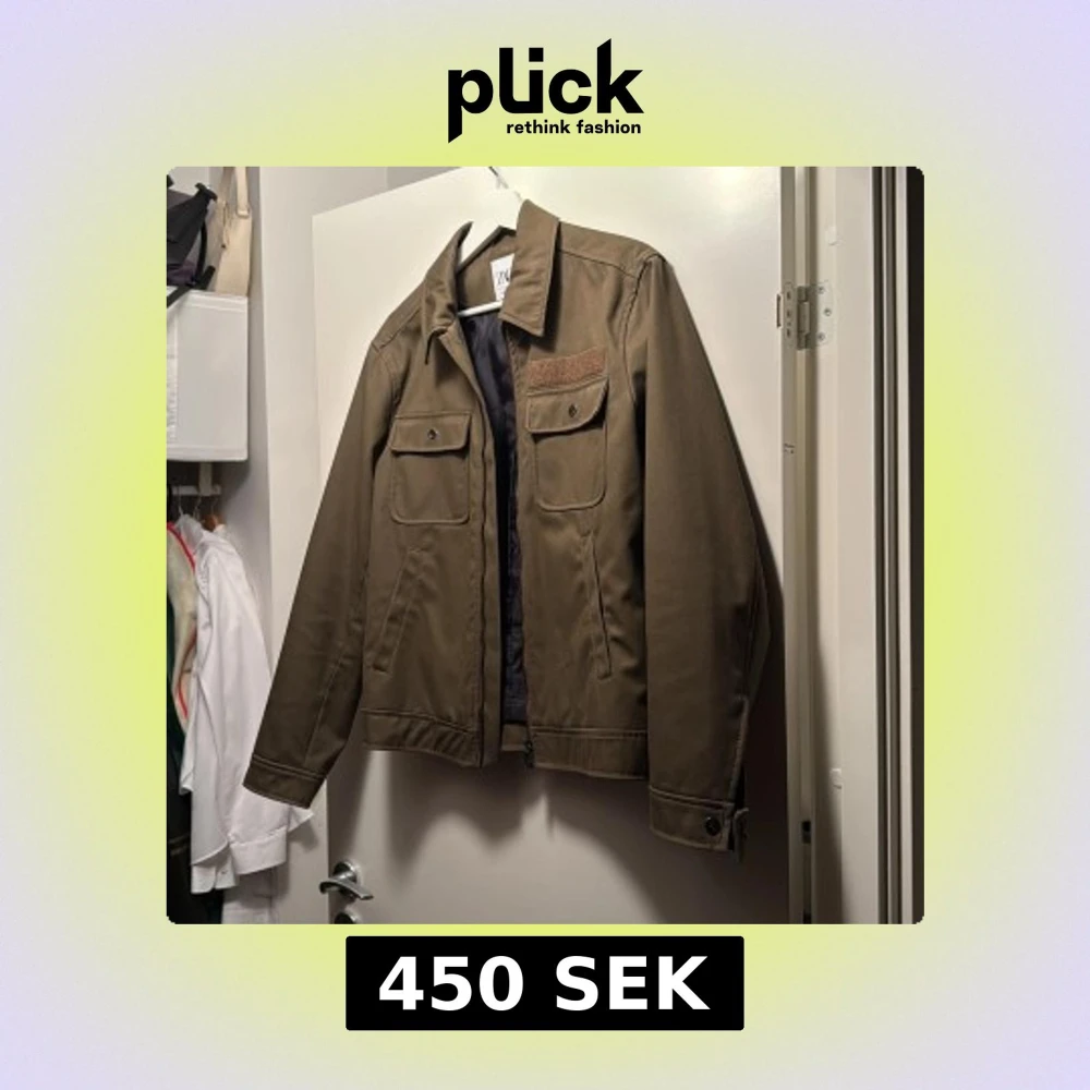 Snygg olivgrön overshirt från Zara med klassisk krage, två stora bröstfickor med knappar och diskreta sidofickor. Jackan har dragkedja framtill och knappar vid ärmslut. Perfekt för dig som gillar stilren och enkel design.