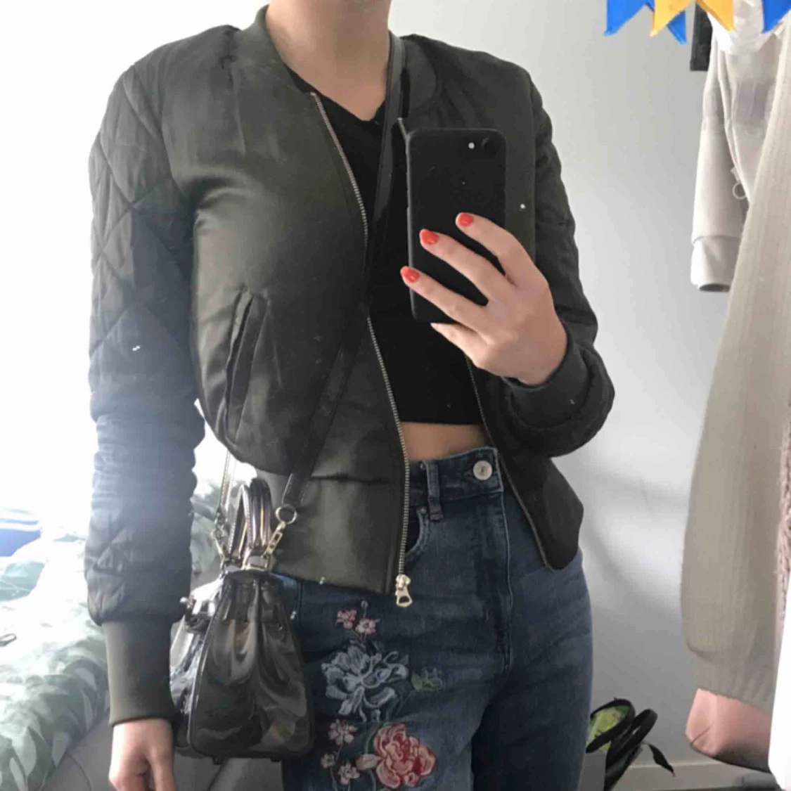 Olivgrön bomberjacka med quiltade armar. Skönt ”glansigt” material. Färgen är något varmare i verkligheten. I nacken finns nån sorts fläck, men det syns knappt (sista bilden). Troligen på grund av hårolja. Pris kan diskuteras! Sorry för smutsig spegel.