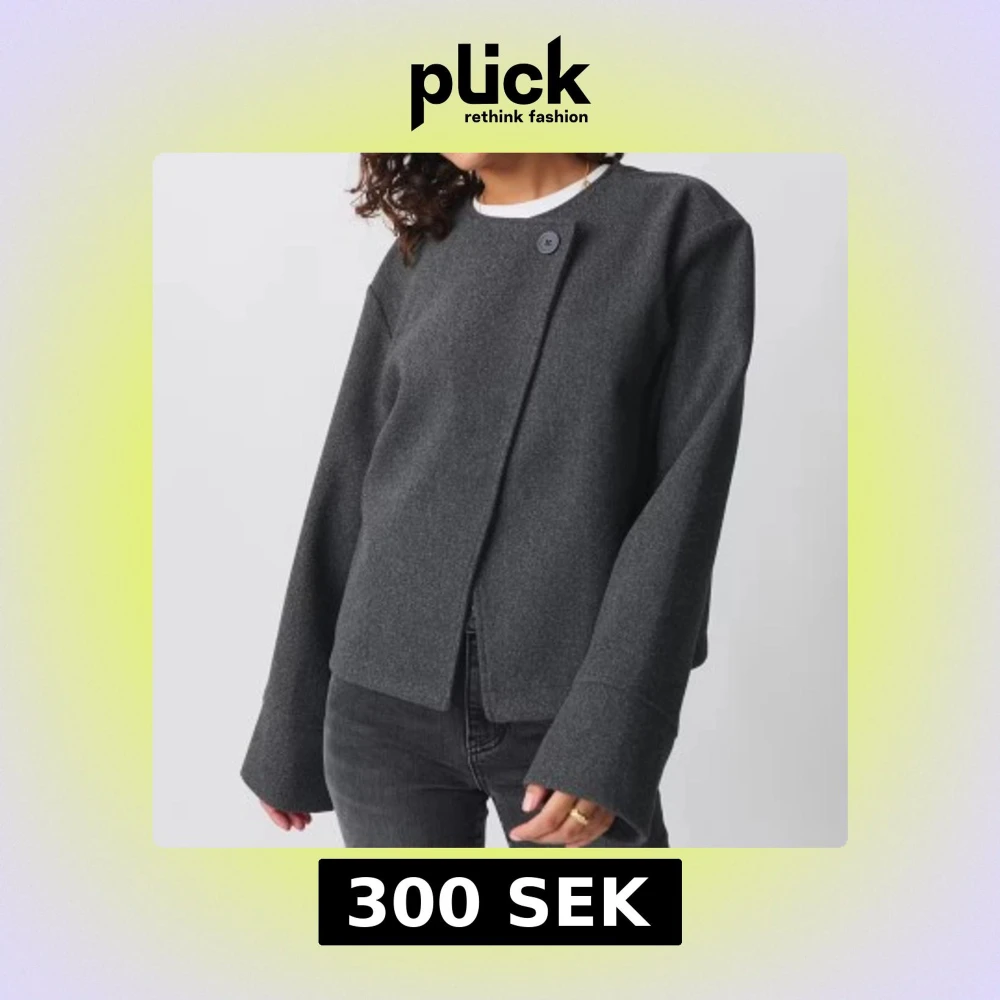 Snygg grå jacka från GinaTricot med omlott-design och en stor knapp framtill. Jackan har en rak, croppad passform och långa ärmar med breda muddar. Perfekt för lite kyligare dagar. Använd endast en gång. Slutsåld på hemsidan. Skriv för egna bilder.