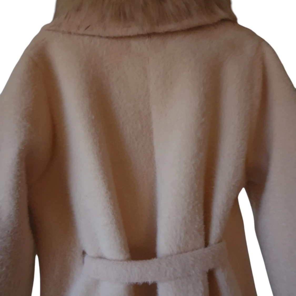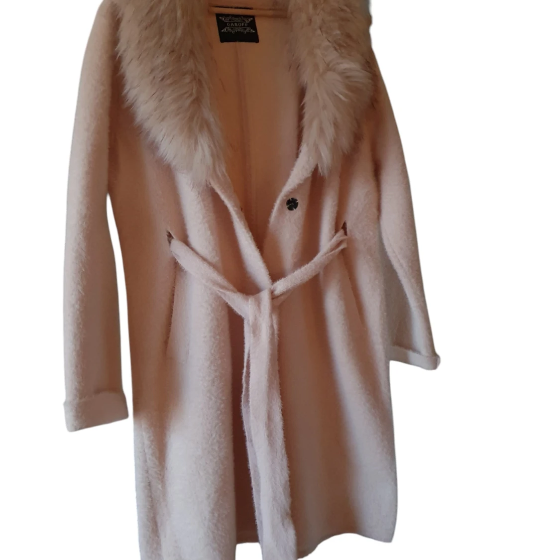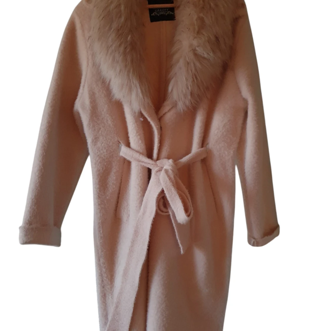 Snygg kappa av märket Garoff, mjukt och fluffigt tyg med en avtagbar pälskrage, (i syntet). Färgen är i beige. Den har en smal passform och en snygg skärning med midjeband. Kappan är perfekt för kalla vinterdagar. Nypris 1 599:-.