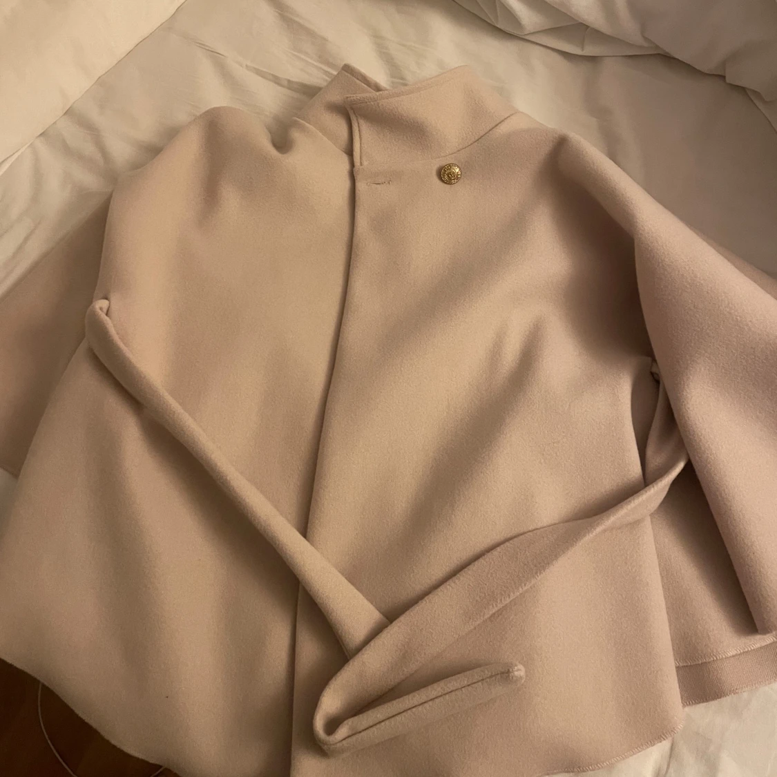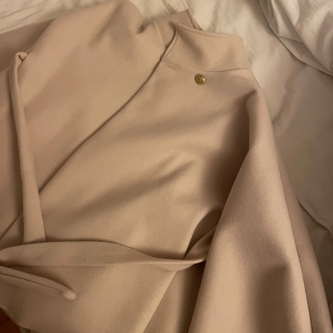 Snygg beige kappa med knytband i midjan och en knappdetalj vid halsen. Den har vida ärmar och passar perfekt för höst och vår. Kappan är från missäy💕använd få gånger! så väldigt fint skick