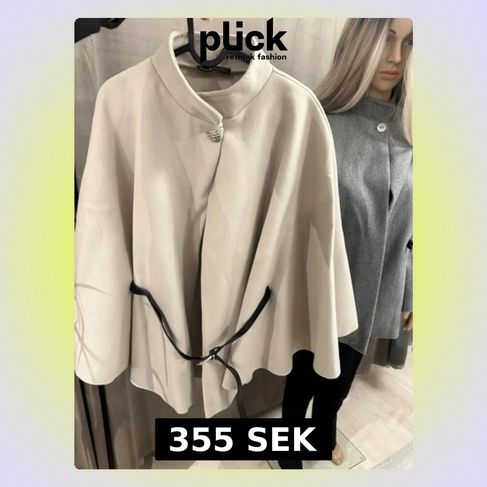 Snygg beige cape-kappa med hög krage och dekorativ silverknapp vid halsen. Kappan har ett svart bälte i midjan som ger en stilren siluett och ett elegant fall. Perfekt för dig som vill ha en trendig och tidlös look.