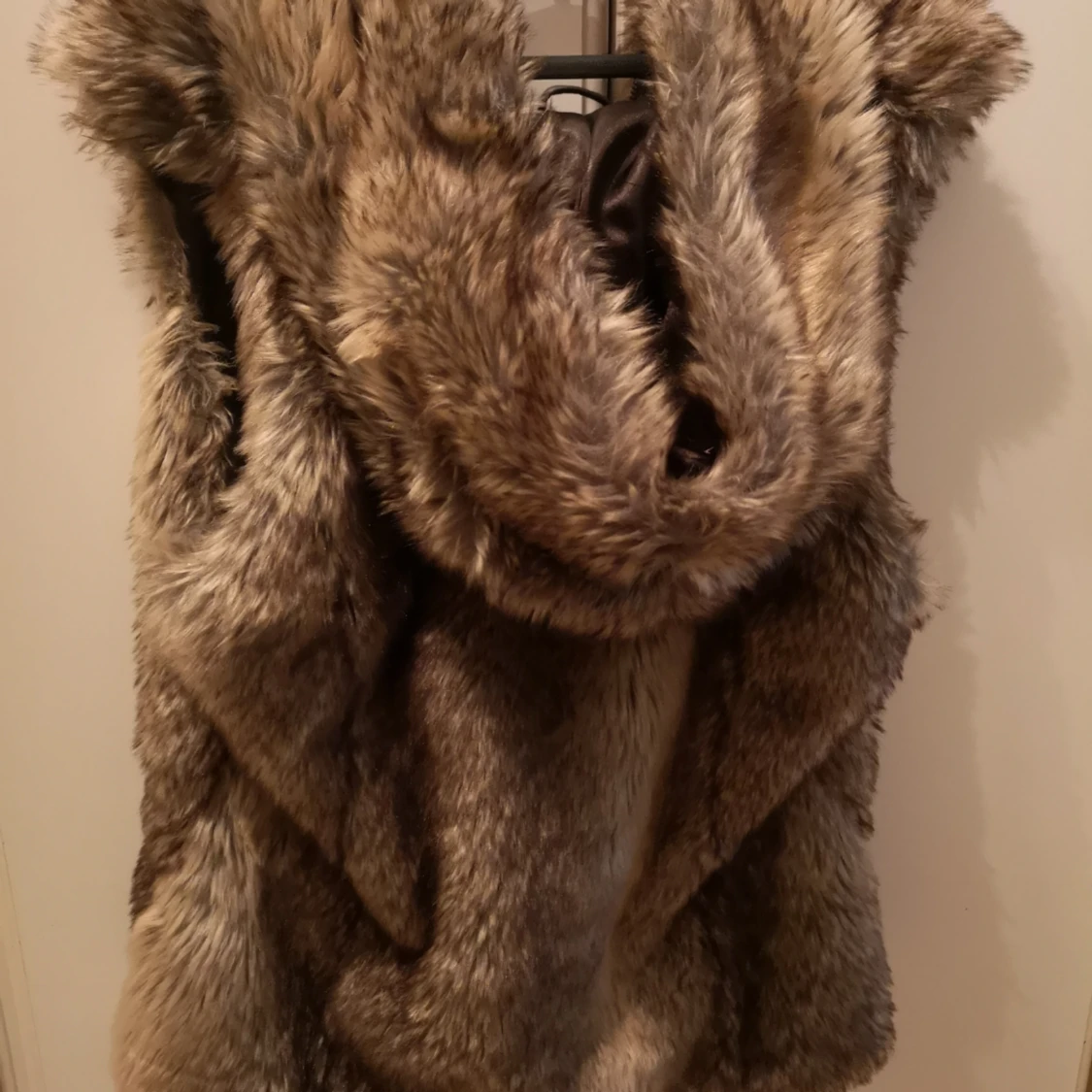 Pälsväst i storlek xl (oäkta päls) från nelly, väldigt sparsamt använt ca 2-3 gånger, fickor i fram och en stor mysig luva. Håller värme jättebra passar till höst vår och vinter. Kan skickas mot porto.