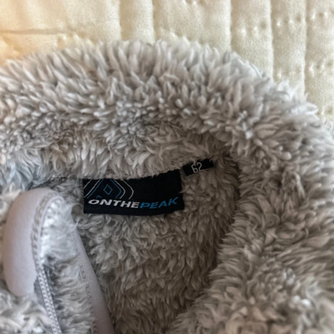 Mysig grå teddyjacka från On The Peak i storlek 62. Jackan har fluffig yta, hög krage och dragkedja framtill. Perfekt för kyliga dagar och har långärmade ärmar. Snygg detalj med logopatch på ena ärmen.