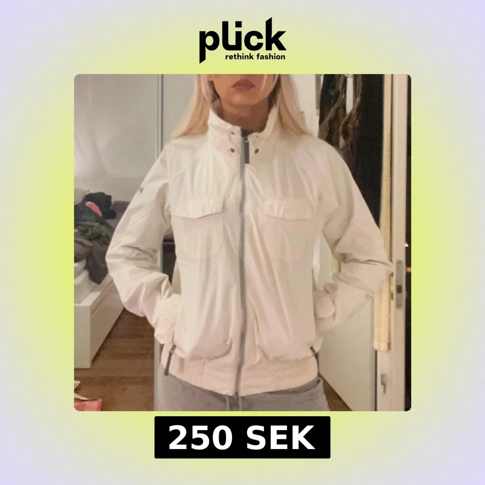 Snygg vit vindjacka med dragkedja och hög krage. Jackan har praktiska fickor med lock och ribbade muddar vid ärmslut och nederkant. Perfekt för blåsiga dagar.