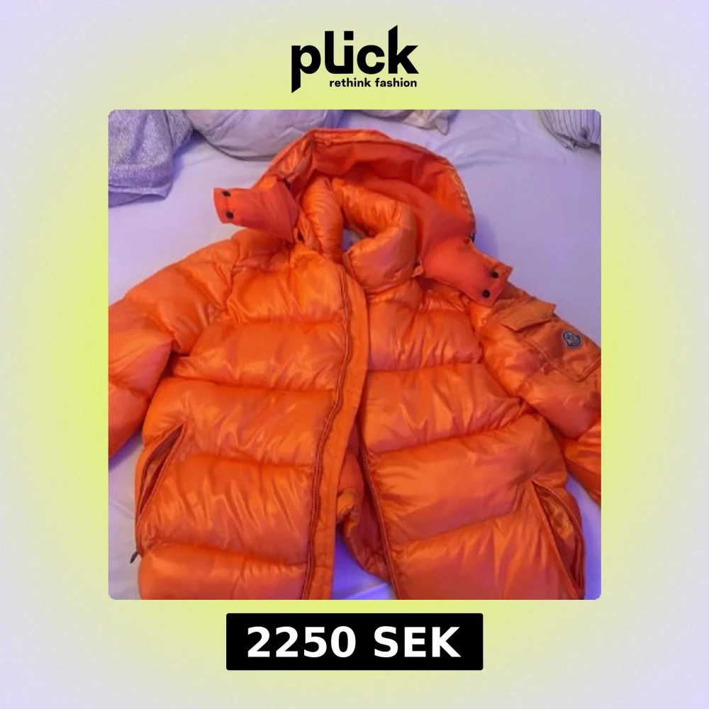 Säljer en fet orange dunjacka från Moncler med hög krage och huva. Jackan har Moncler-logga på ärmen, dragkedja och tryckknappar framtill samt flera fickor. Materialet är glansig polyester och dunfyllning, perfekt för kalla dagar. Taggar och etiketter sitter kvar. QR KOD och NFC!