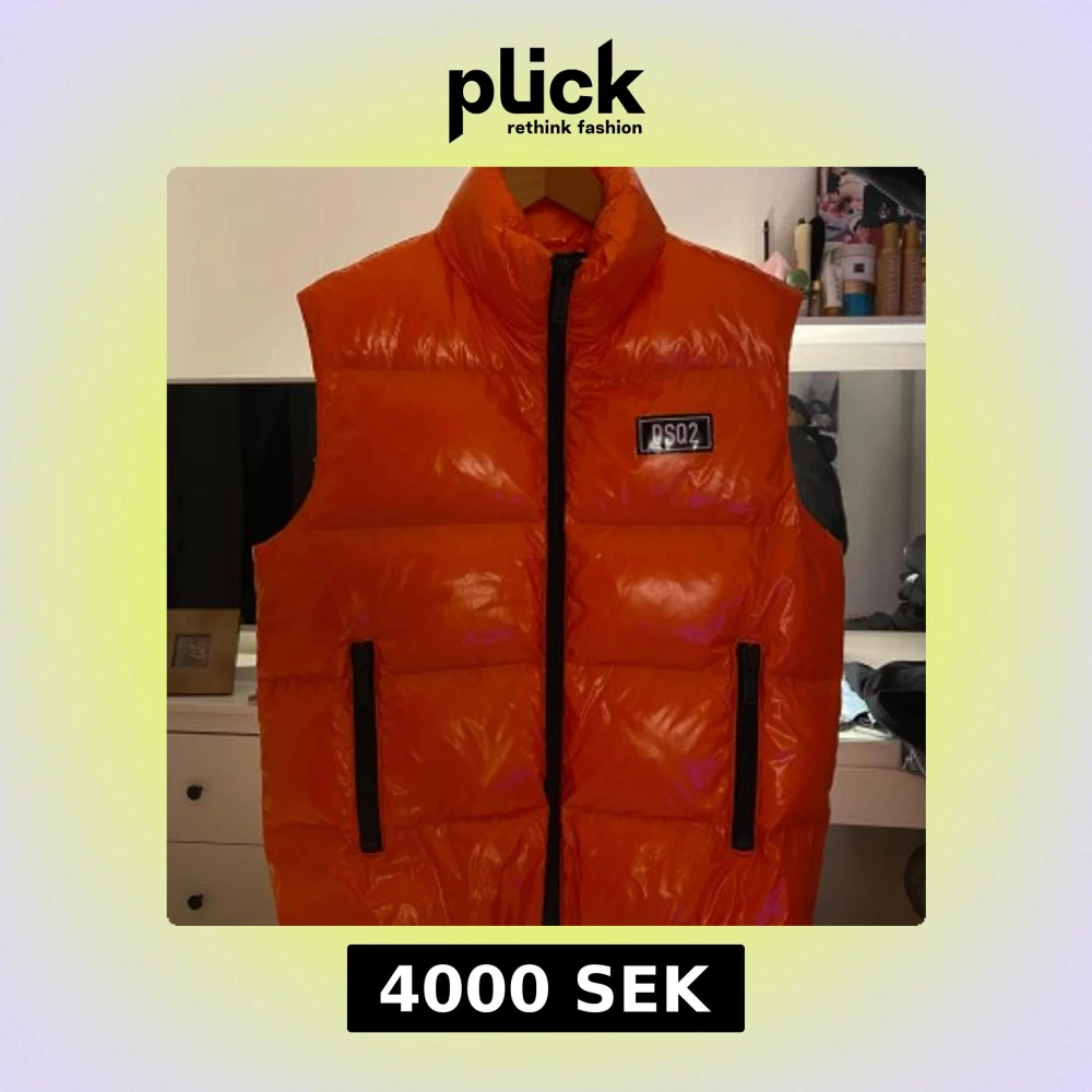 Säljer en cool orange dunväst från DSQ2 med hög krage och dragkedja framtill. Västen har två svarta dragkedjefickor och en stor logga på bröstet samt en patch på ryggen. Perfekt för att sticka ut i mängden!