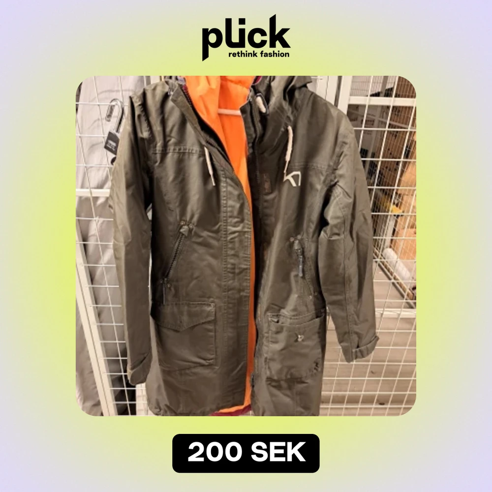 Säljer en snygg grön parkajacka från Kari Traa. Den har en cool orange insida och är perfekt för höst och vår. Jackan har långa ärmar och praktiska dragkedjor på fickorna. Dessutom finns det en justerbar bälte i midjan för en bättre passform. Perfek