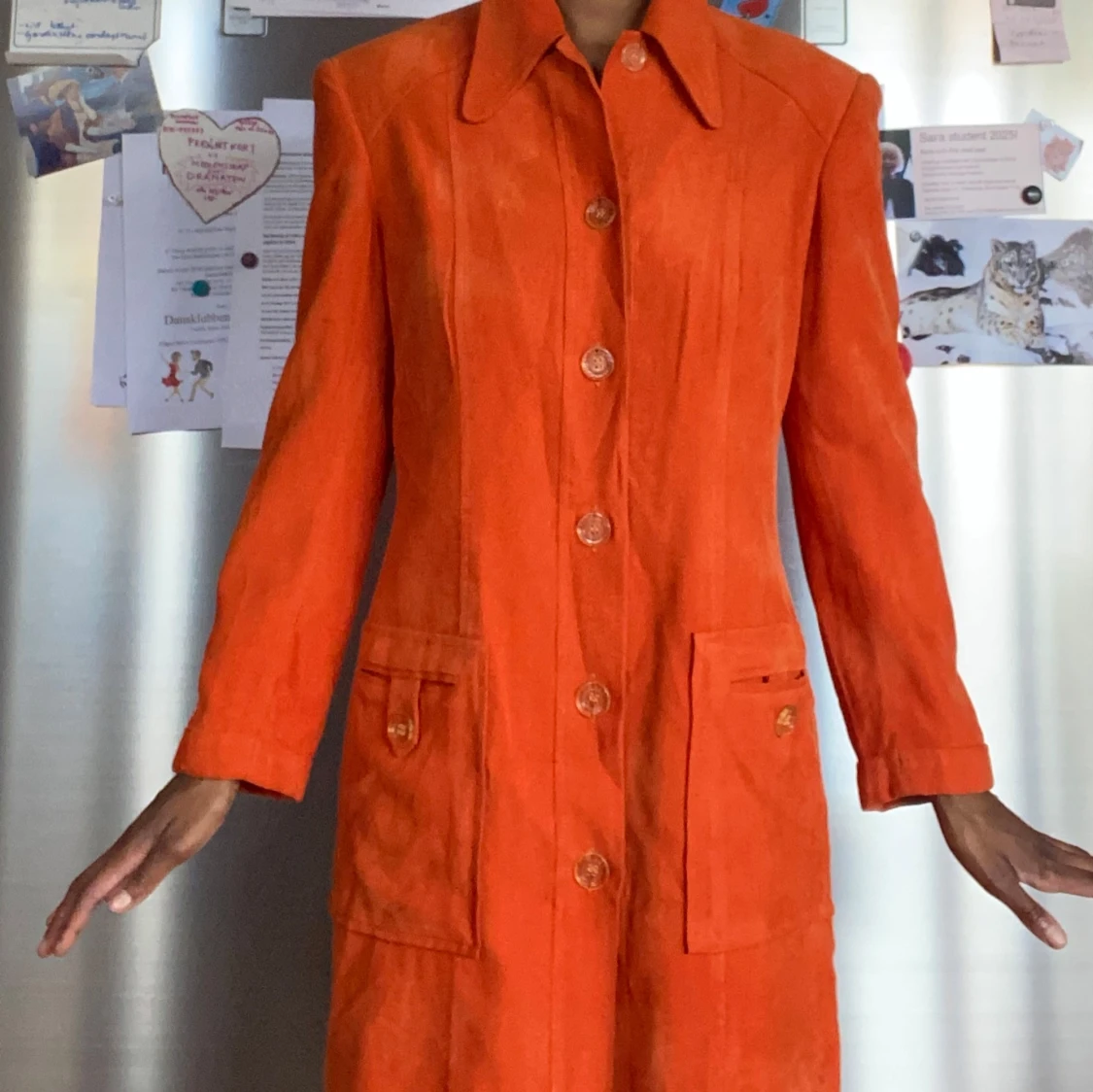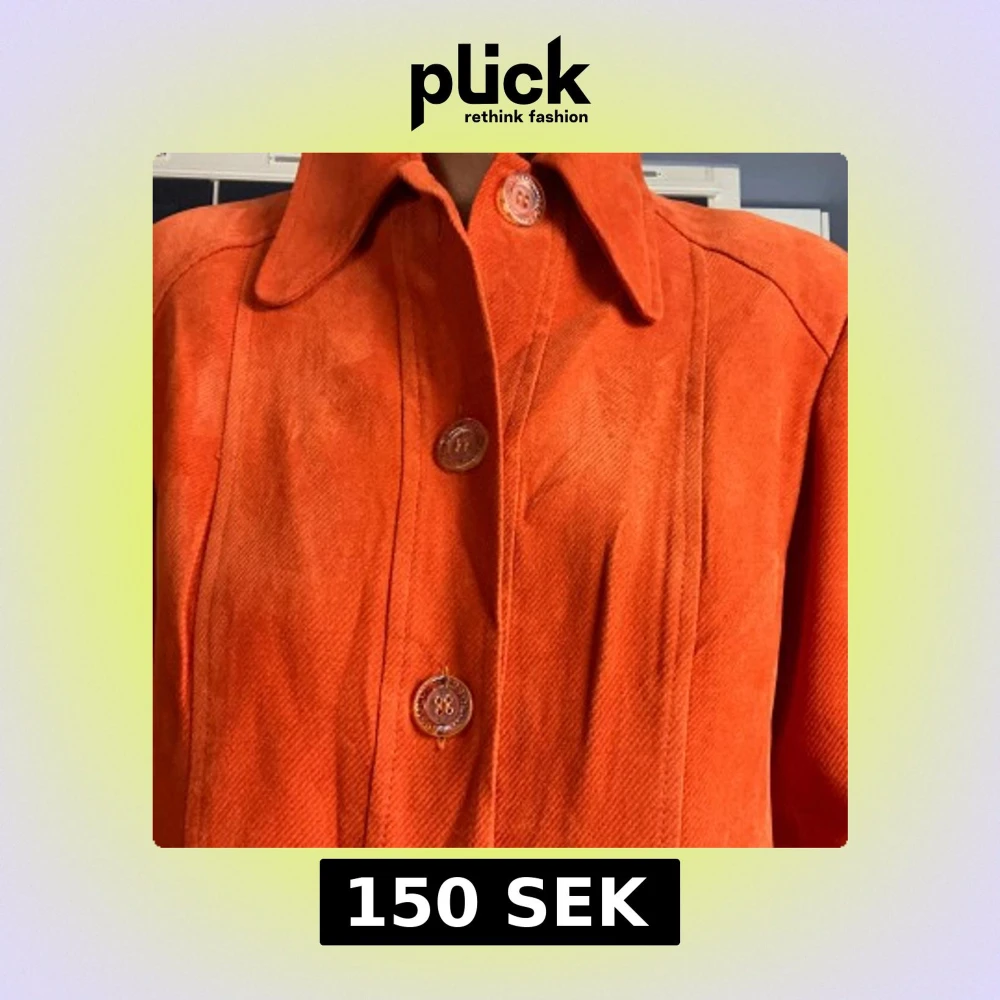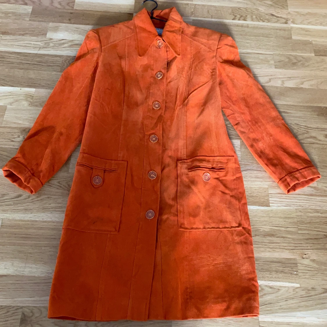 Snygg vintage orange kappa i manchester med dekorativa knappar och två stora fickor framtill. Jackan har klassisk krage och raka ärmar, perfekt för hösten eller som en sensommar jacka. sticka u. Lång modell, räcker mig som är 163 över knäna precis. Fint skick förutom små kajal märken.