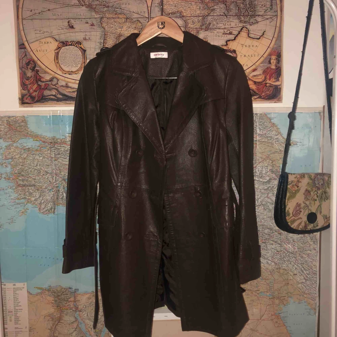 Brun läderkappa med skärp som går ner till låret. Nästan helt oanvänd, extraknappar finns på insidan. 200kr eller högst bjudande