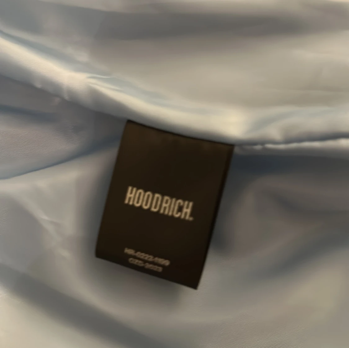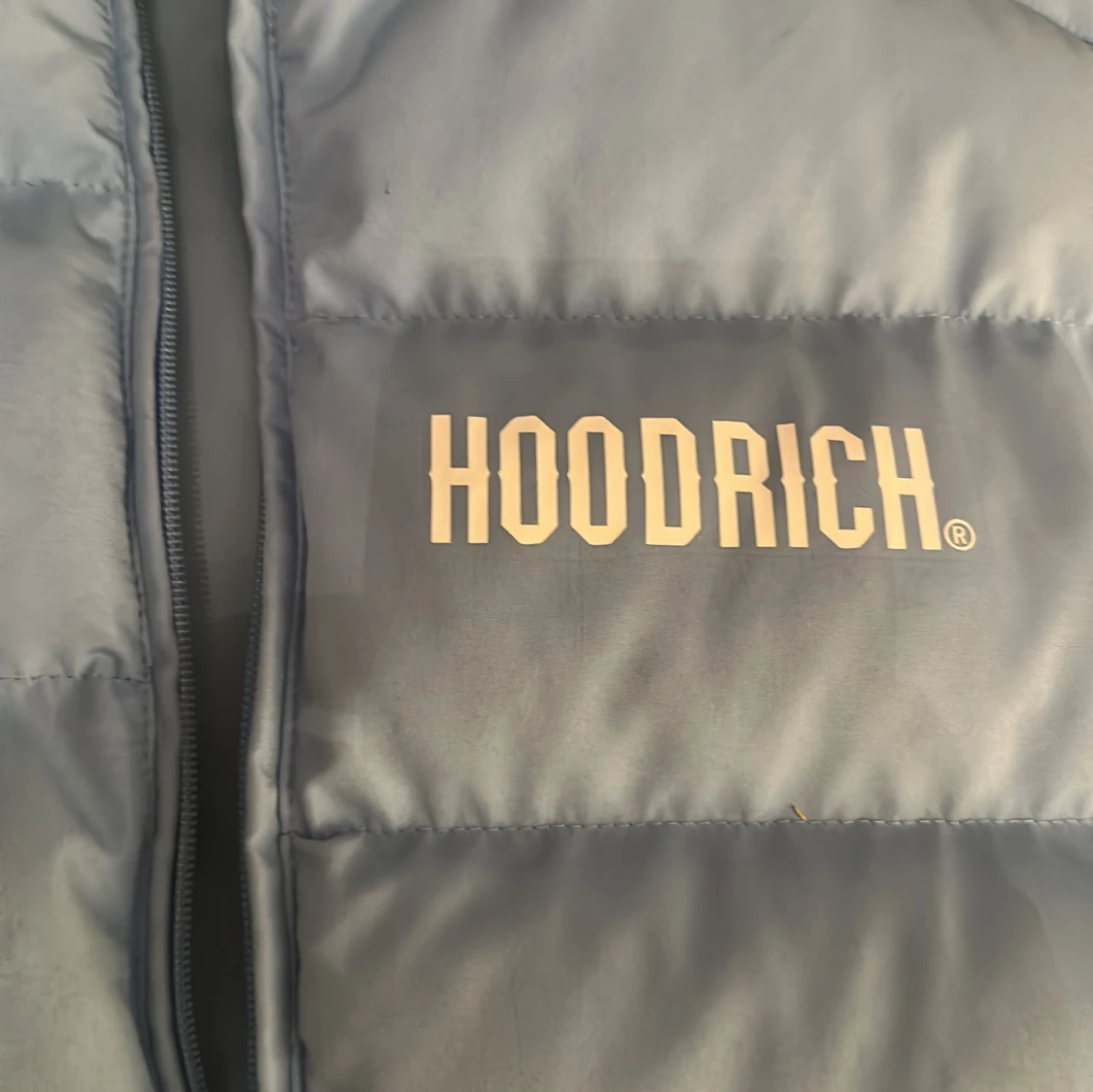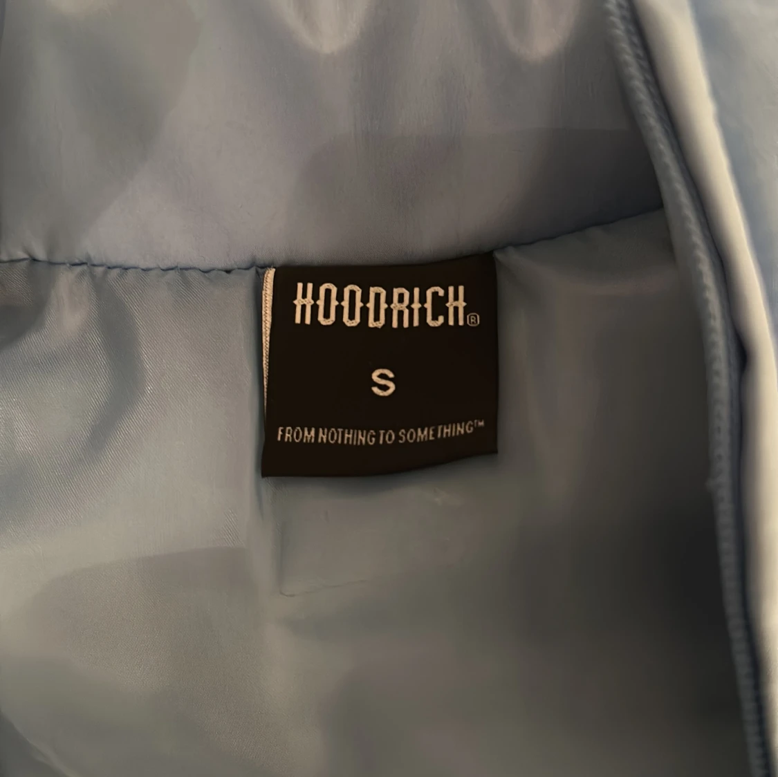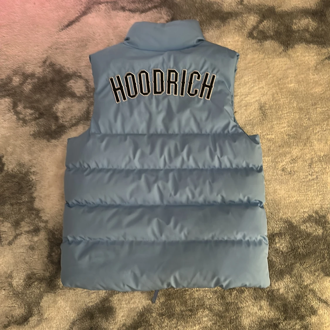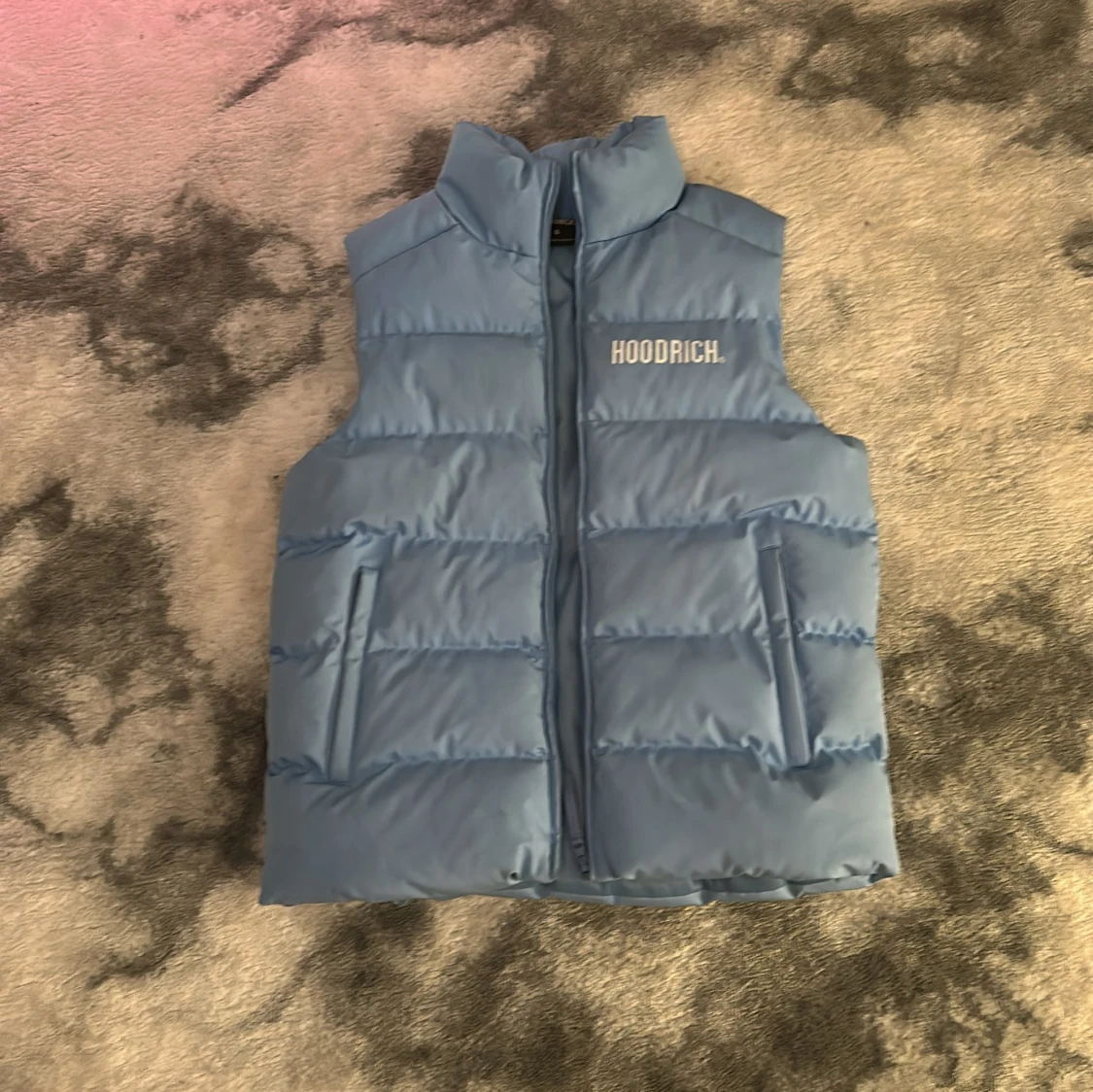 Säljer en ljusblå dunväst från Hoodrich med stor logga på ryggen och mindre tryck fram. Västen har hög krage, två fickor och dragkedja framtill. Perfekt för lager-på-lager och streetwear-vibe.