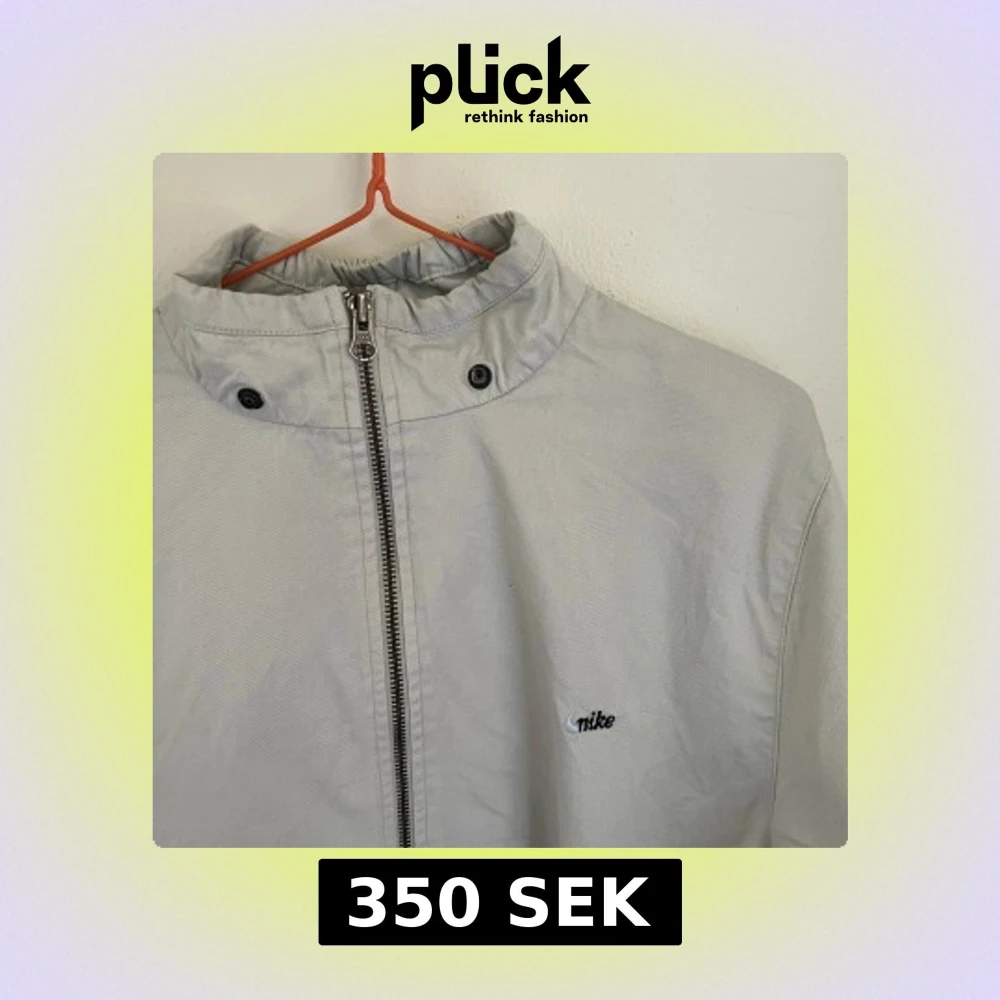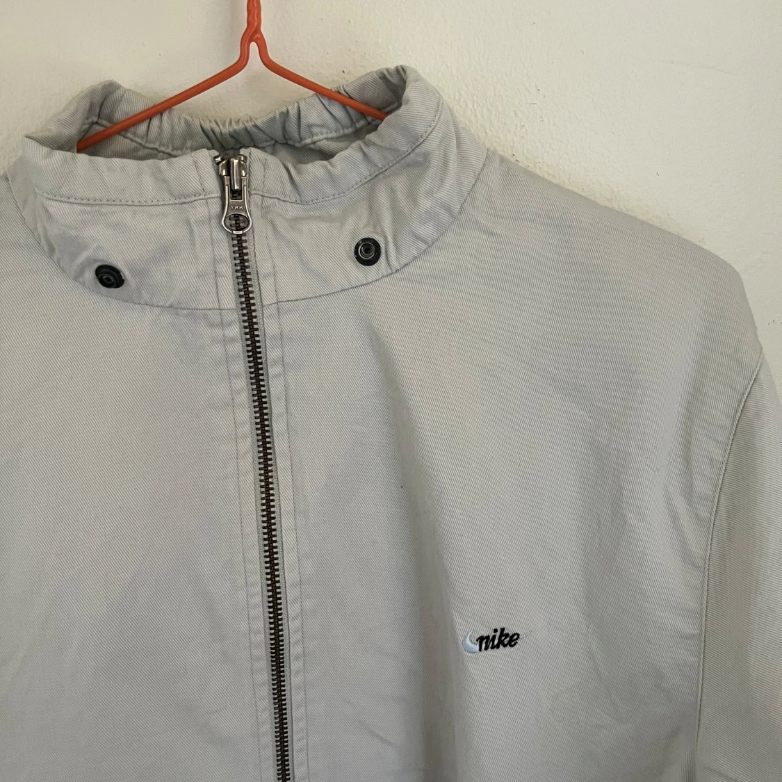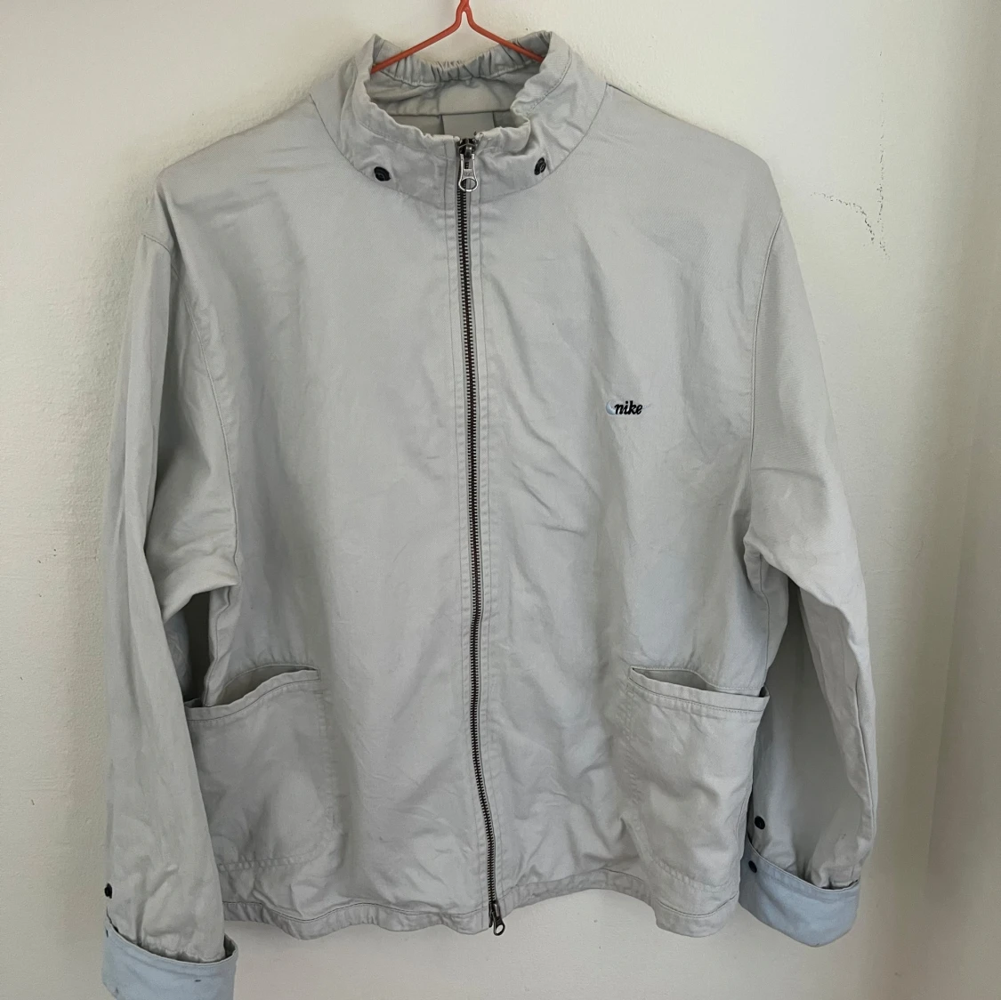 Nike bommulsjacka med minimalistisk design och diskret logga på bröstet. Jackan har hög krage, hel dragkedja framtill, två stora fickor och knappar vid ärmslut. Lite fläckig vid armarna(se bilder).