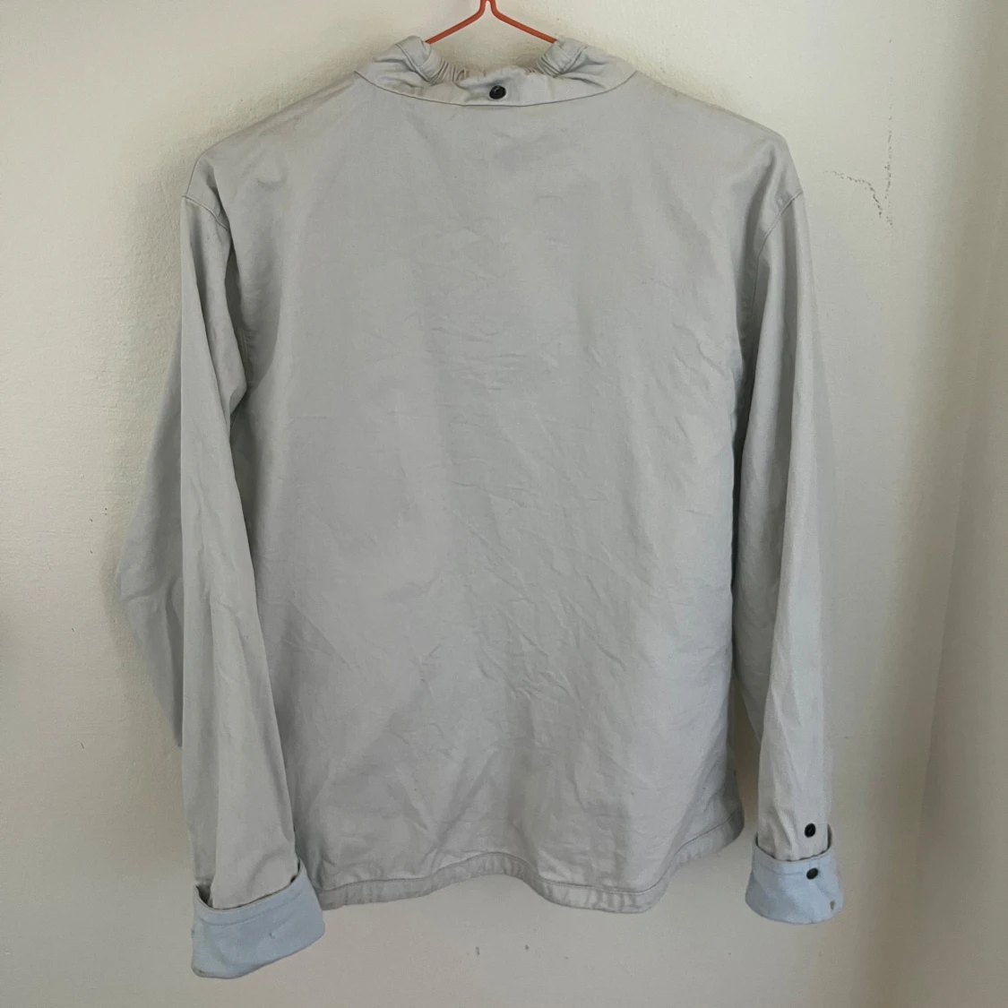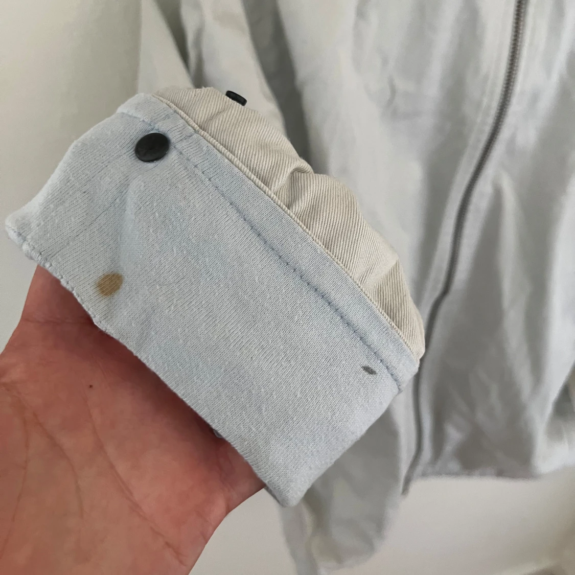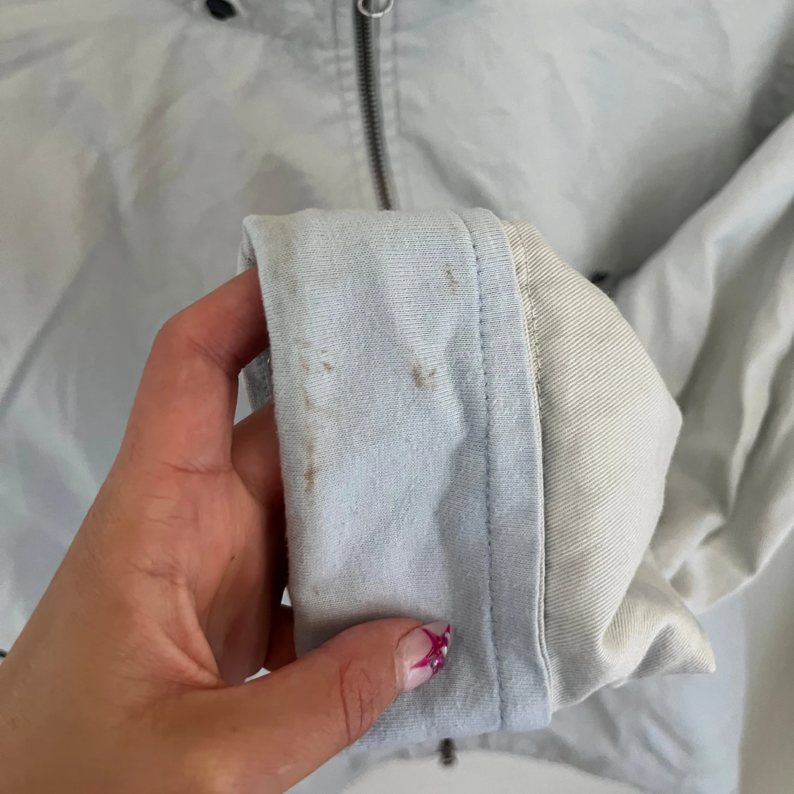 Nike bommulsjacka med minimalistisk design och diskret logga på bröstet. Jackan har hög krage, hel dragkedja framtill, två stora fickor och knappar vid ärmslut. Lite fläckig vid armarna(se bilder).
