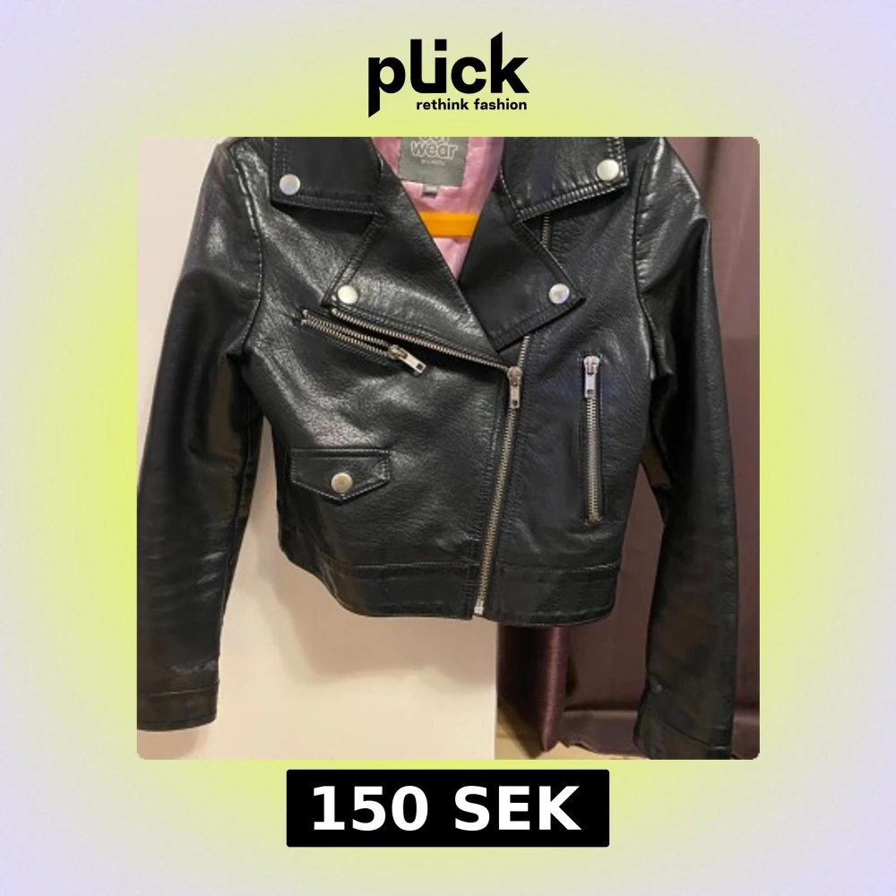 Svart jacka med dragkedja och tryckknappar. Jackan har två fickor med dragkedja och en fakeficka med tryckknapp. Fodret är rosa. Den har defekter på ärmsluten, se bild 4 och 5.
