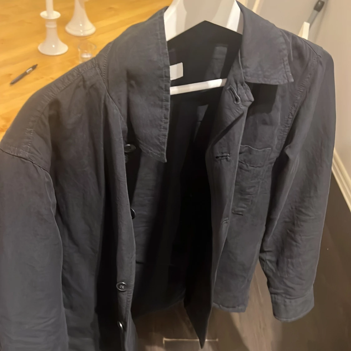 Tröjan är lite oversized vilket gör att den passar S Stilren svart overshirt från Uniqlo i storlek XS. Jackan har klassisk krage, knäppning framtill och raka ärmar. Perfekt för lager-på-lager och enkel att matcha med olika outfits. Materialet känns lätt och smidigt.