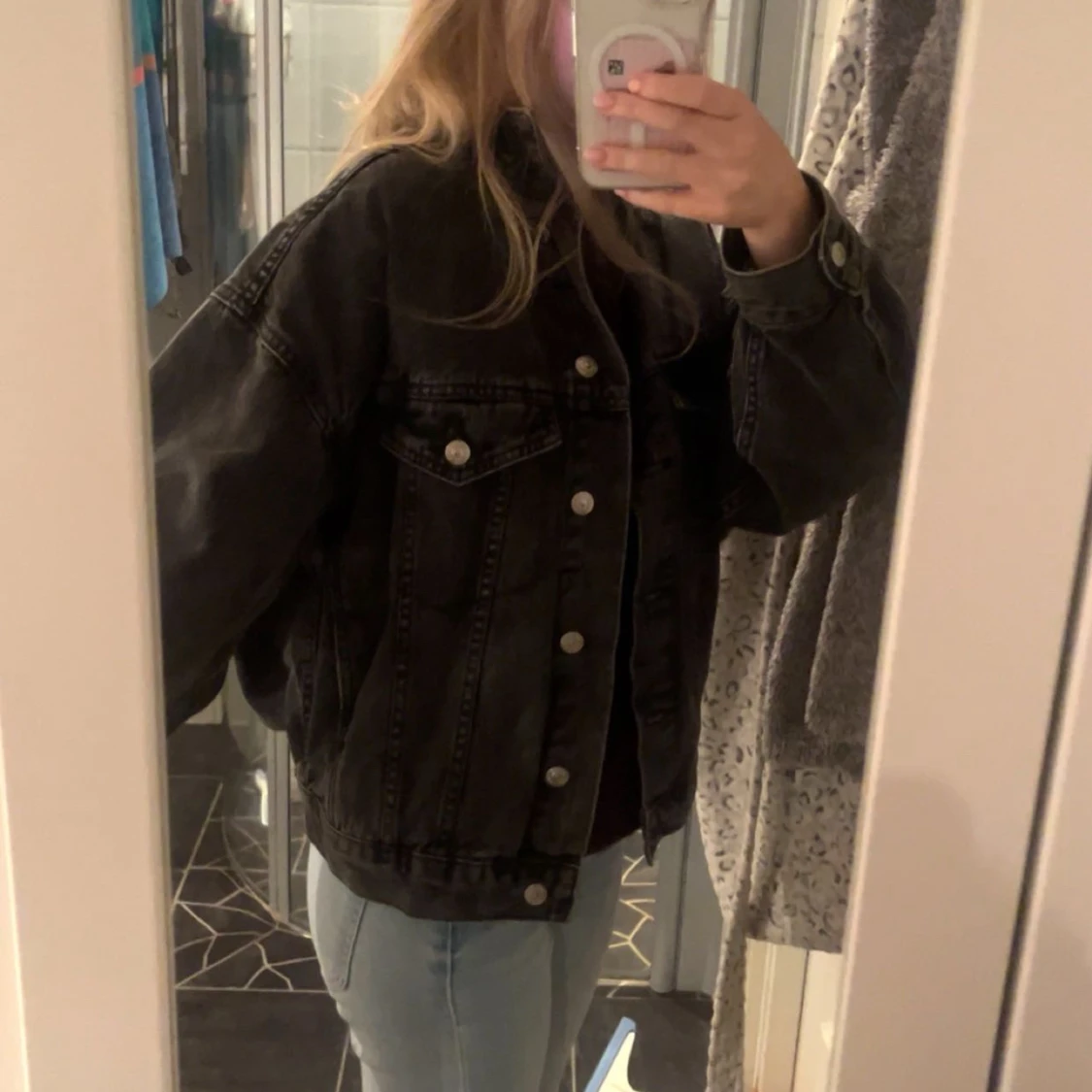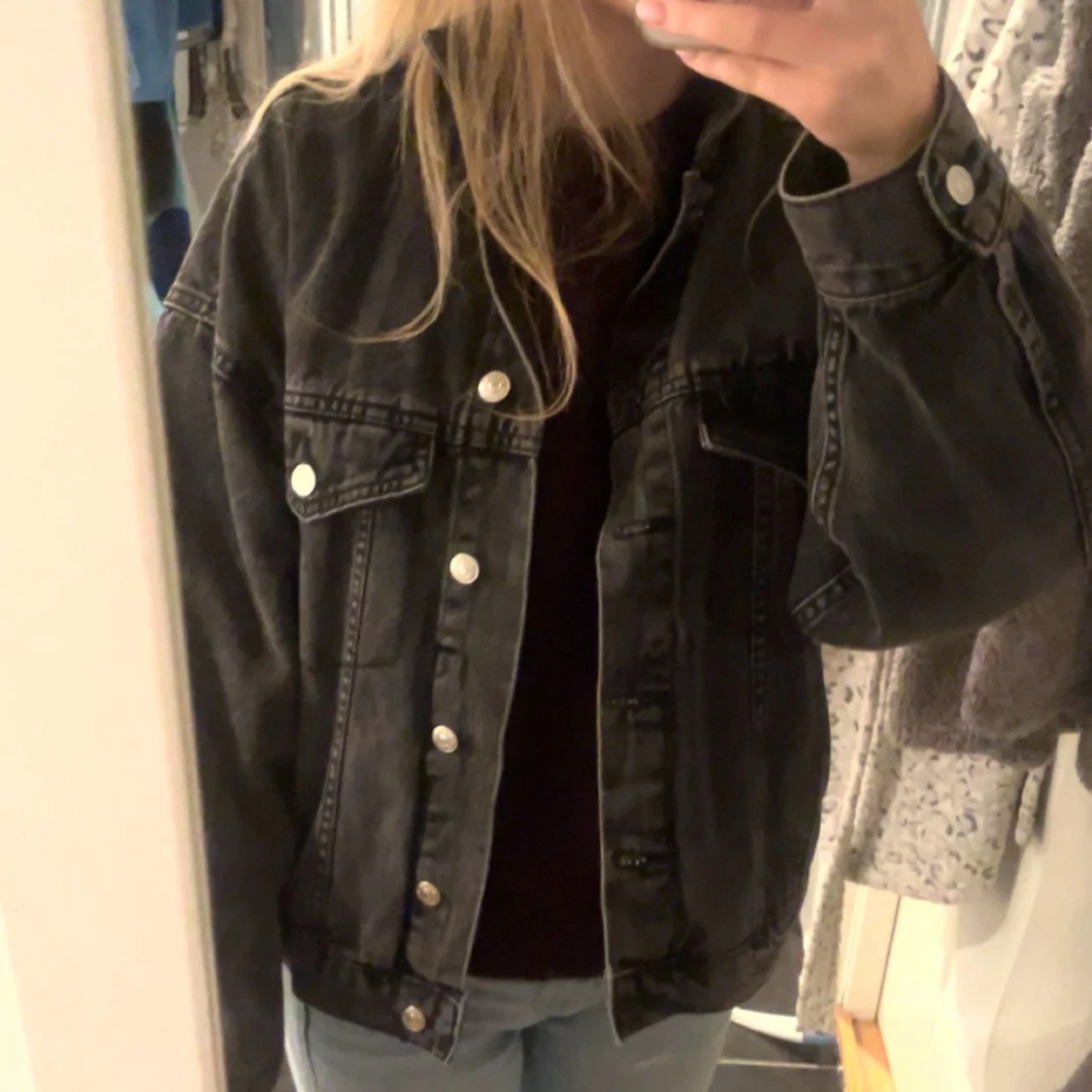 Säljer en svart ”urtvättad” oversized jeansjacka i denim med klassiska silvriga knappar framtill och på ärmsluten. Jackan har två bröstfickor med lock och en avslappnad, loose passform som ger en cool och trendig vibe. Slutsåld, nypris 599💕
