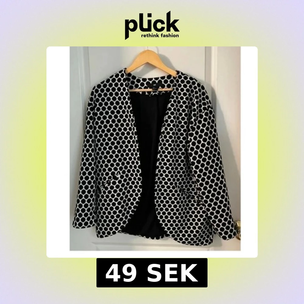 Något over sized i modellen. Mjukt material (polyester och elastan), svart-vit prickig. Fickor i sidan. Aldrig använd. Strl xs