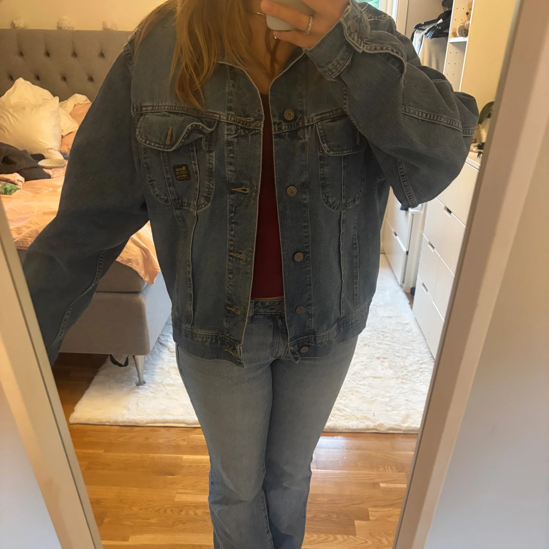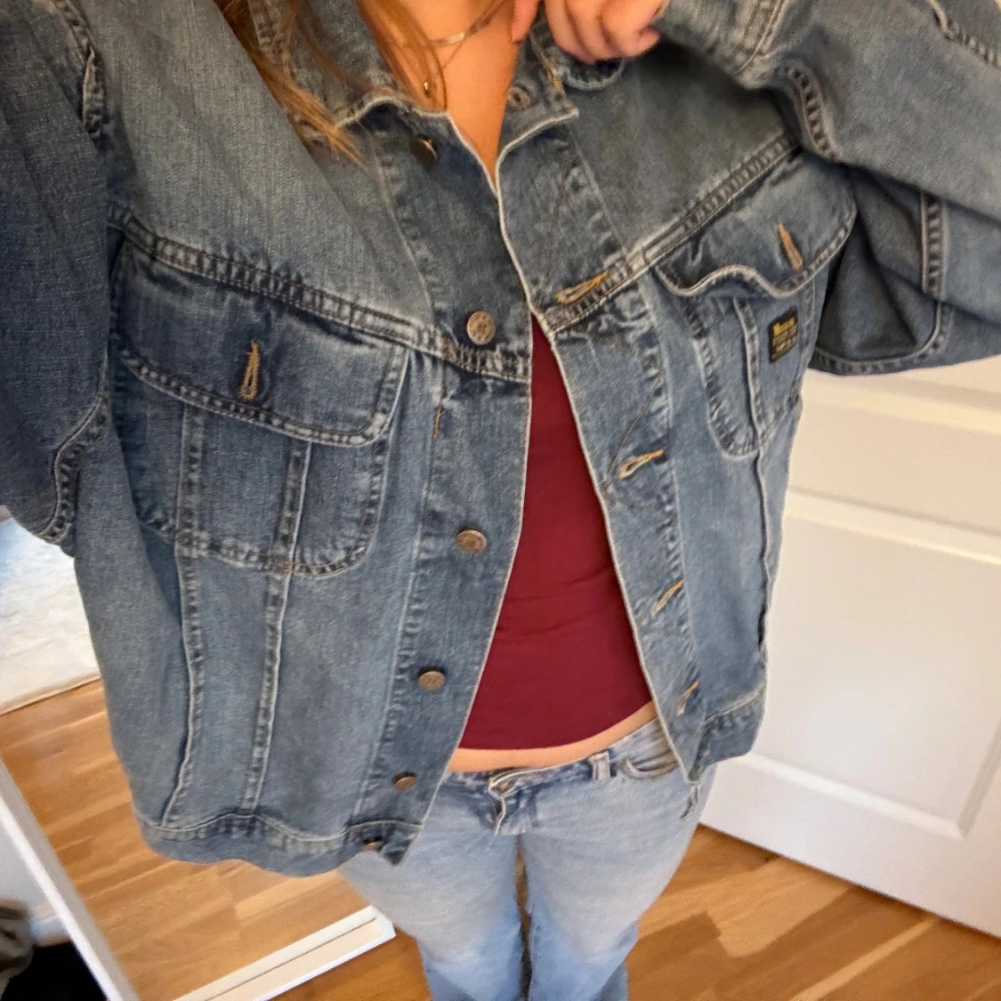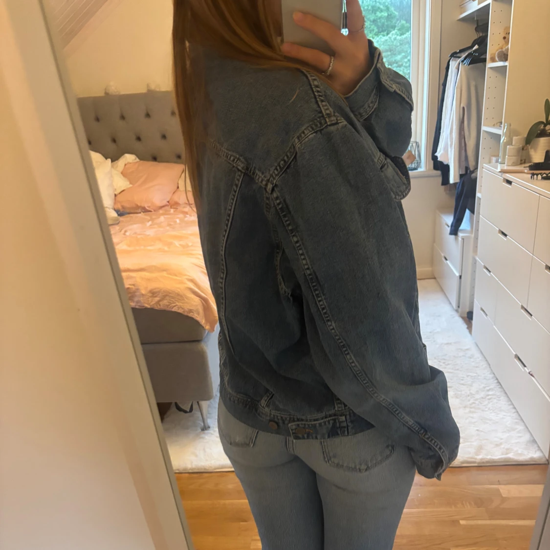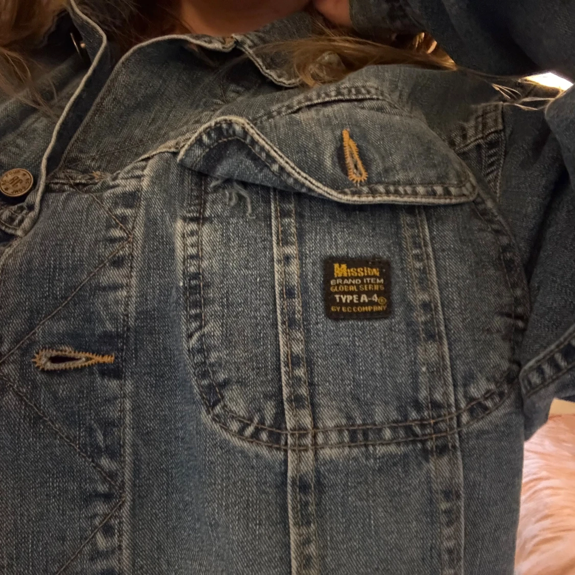 Säljer en oversized blå jeansjacka från Massimo med klassisk design. Jackan har två stora bröstfickor med lock och knappar framtill. Snygga sömdetaljer och en liten svart och gul patch på ena fickan. Perfekt för dig som gillar en avslappnad stil. Passar för både kille och tjej