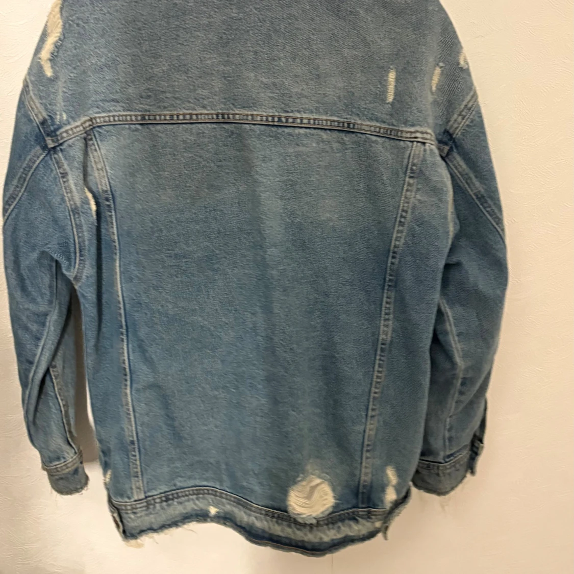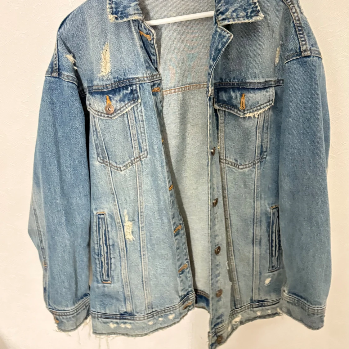 Säljer en oversized ljusblå jeansjacka från Zara med slitna detaljer och klassisk krage. Jackan har knappar framtill, två bröstfickor med lock och två sidofickor. Perfekt för dig som gillar en avslappnad och trendig look.