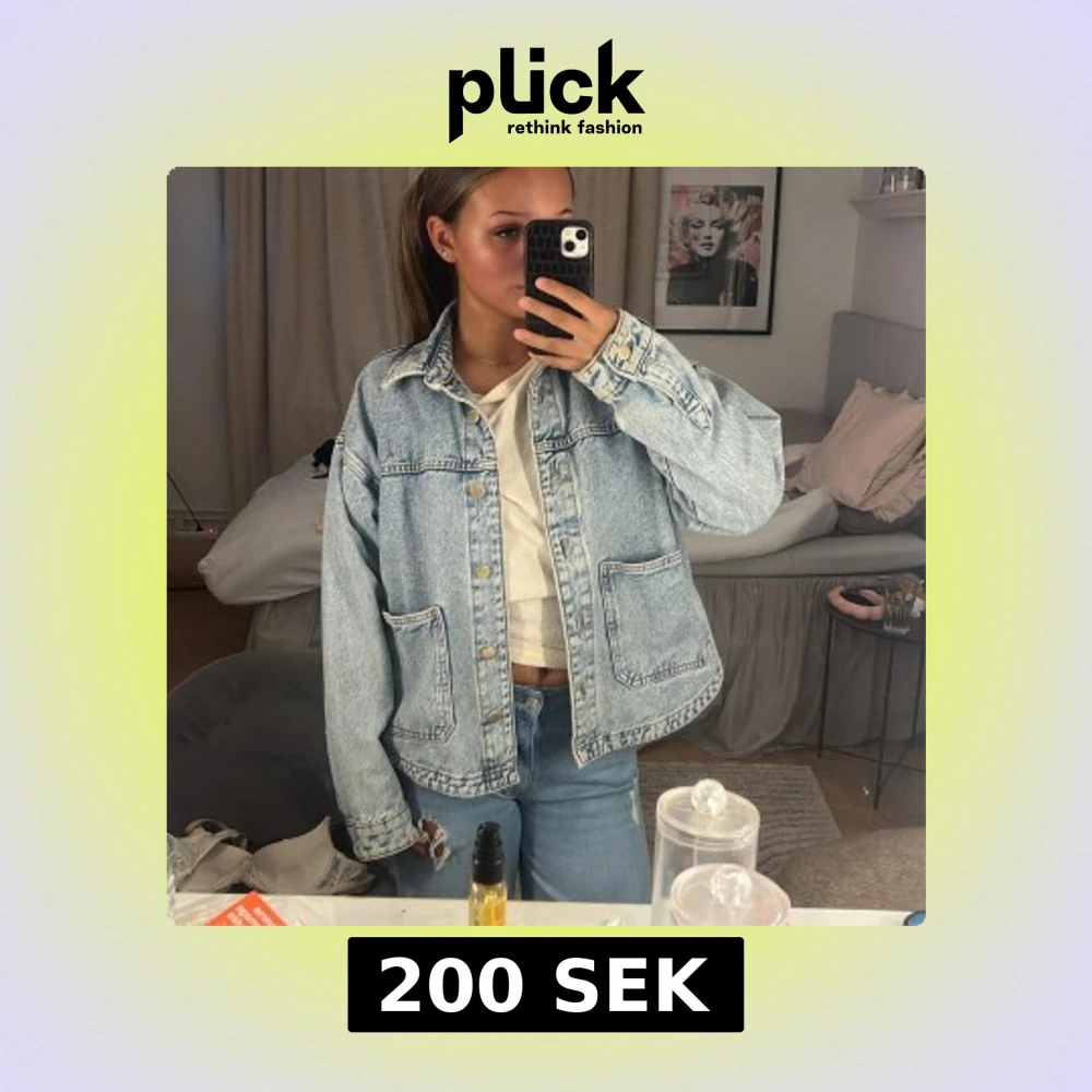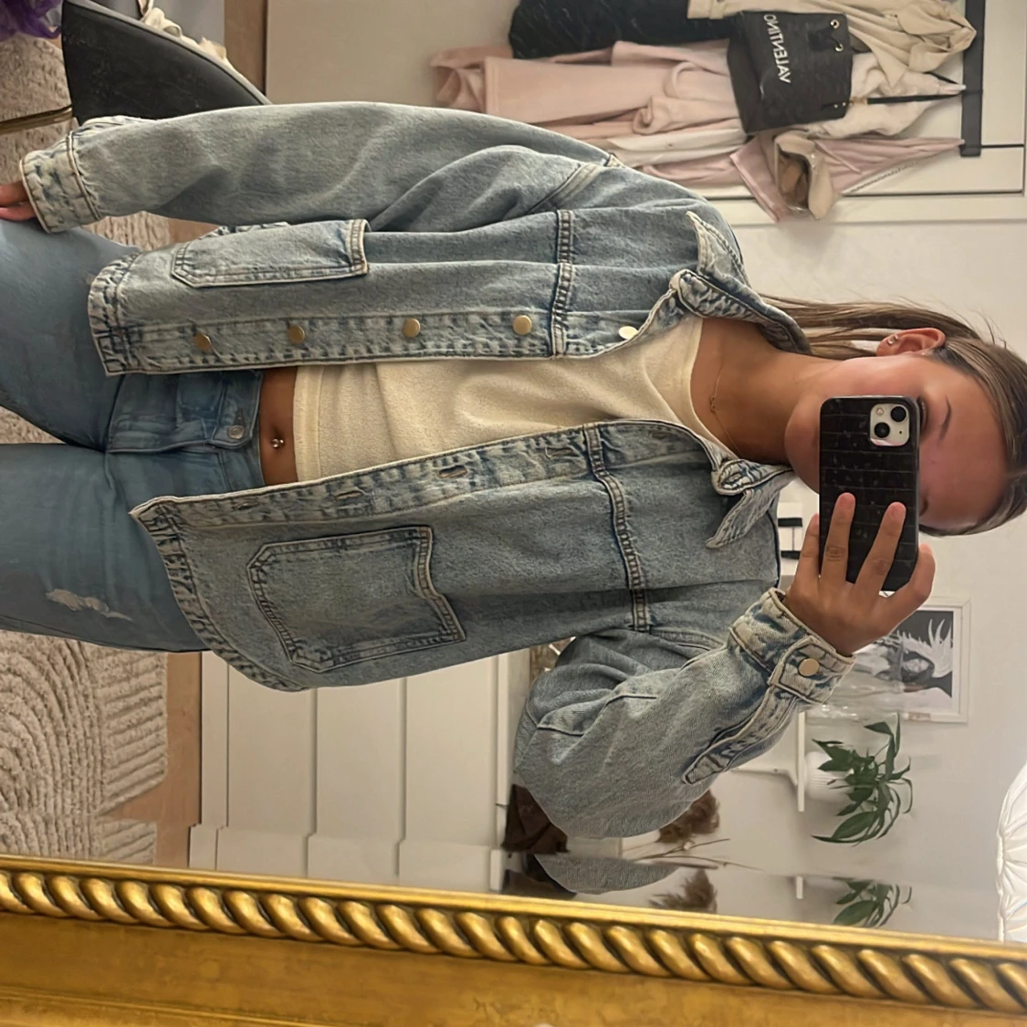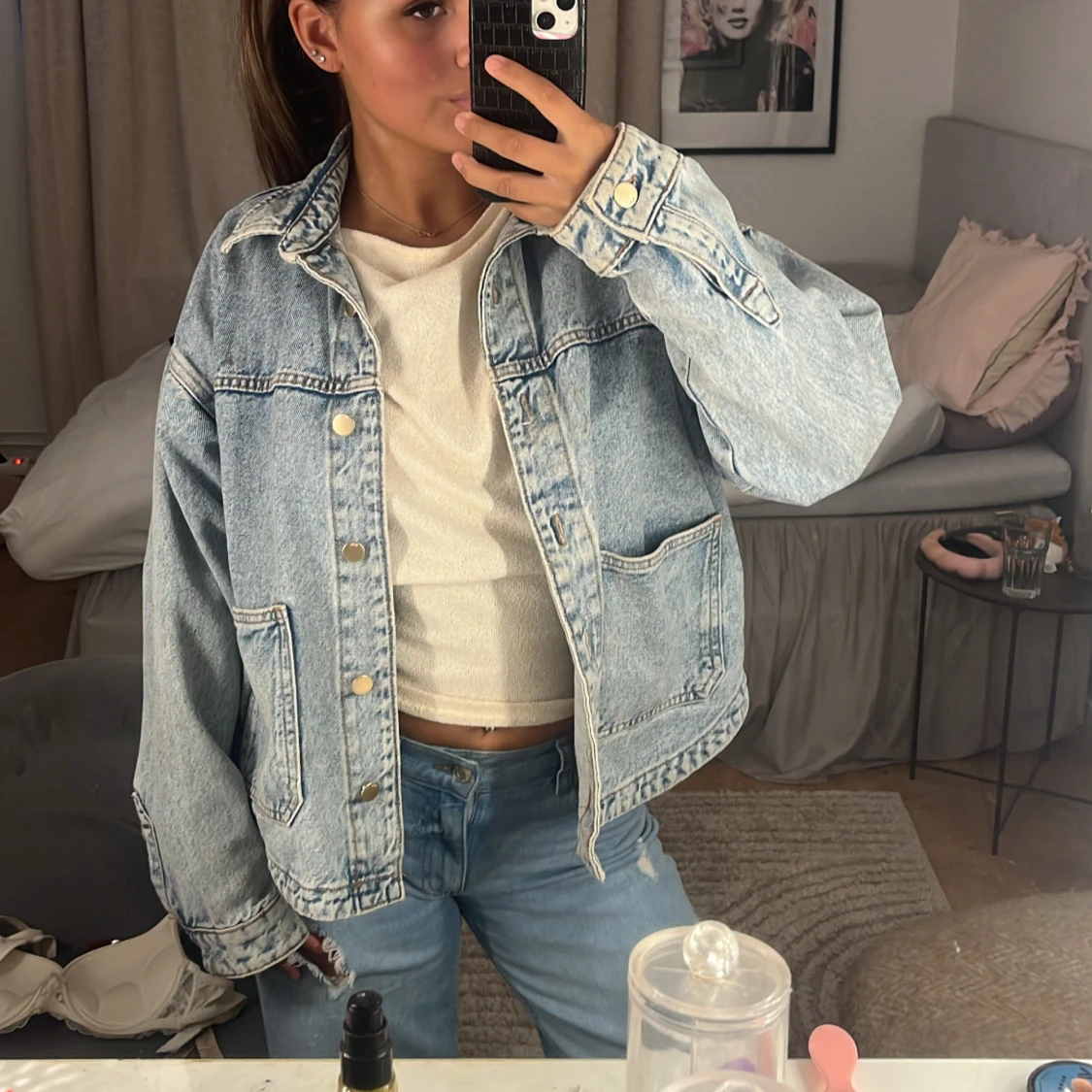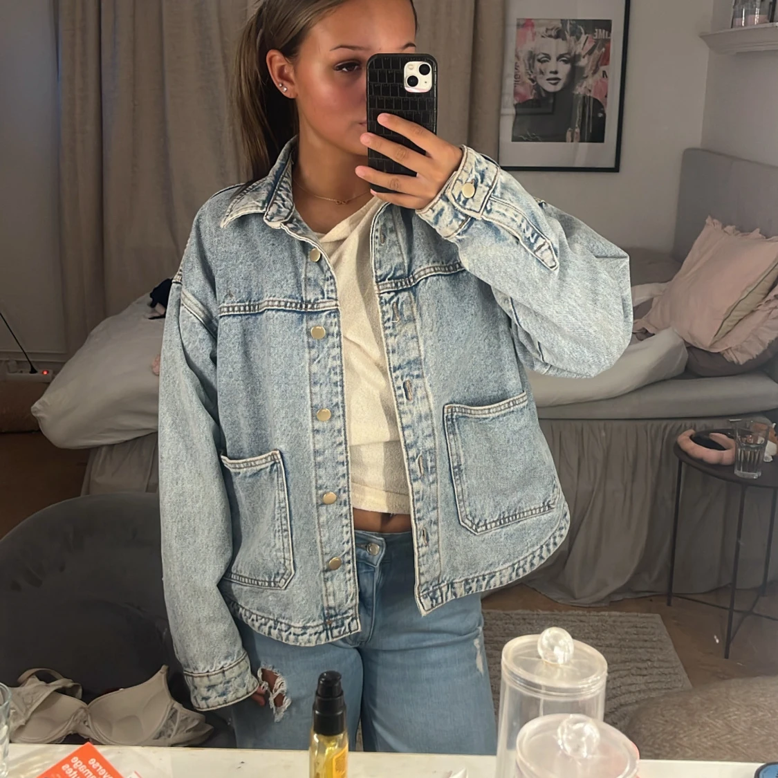 Säljer en oversized ljusblå jeansjacka med klassisk krage och stora framfickor. Jackan har bara andvänts några få tillfällen i somras