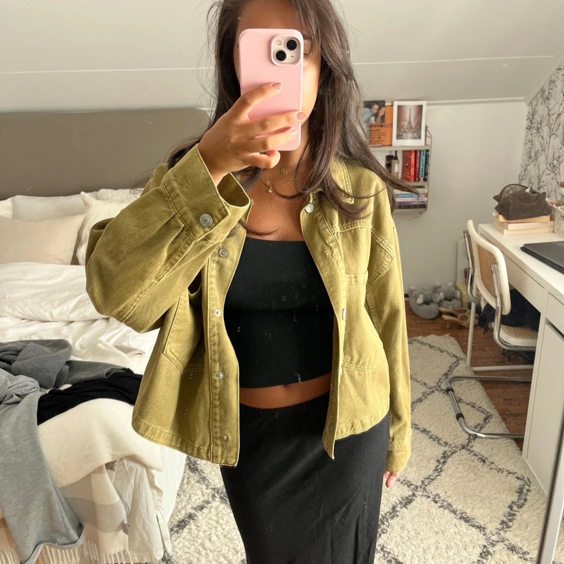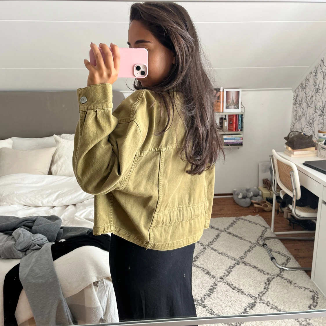 Miltärjacka i strl L, sitter snyggt oversized på mig som är S💕 en knapp har lossnat men inget som man tänker på!