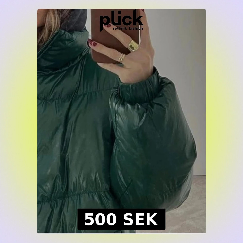 Säljer en mörkgrön lite oversized pufferjacka med hög krage och breda, quiltade sektioner. Jackan har dragkedja framtill och två stora fickor insidan i fleece matarial för att hålla dina händer varma. Materialet är glansigt och känns syntetiskt, perfekt för kalla dagar. Passformen är loose och jackan är långärmad.