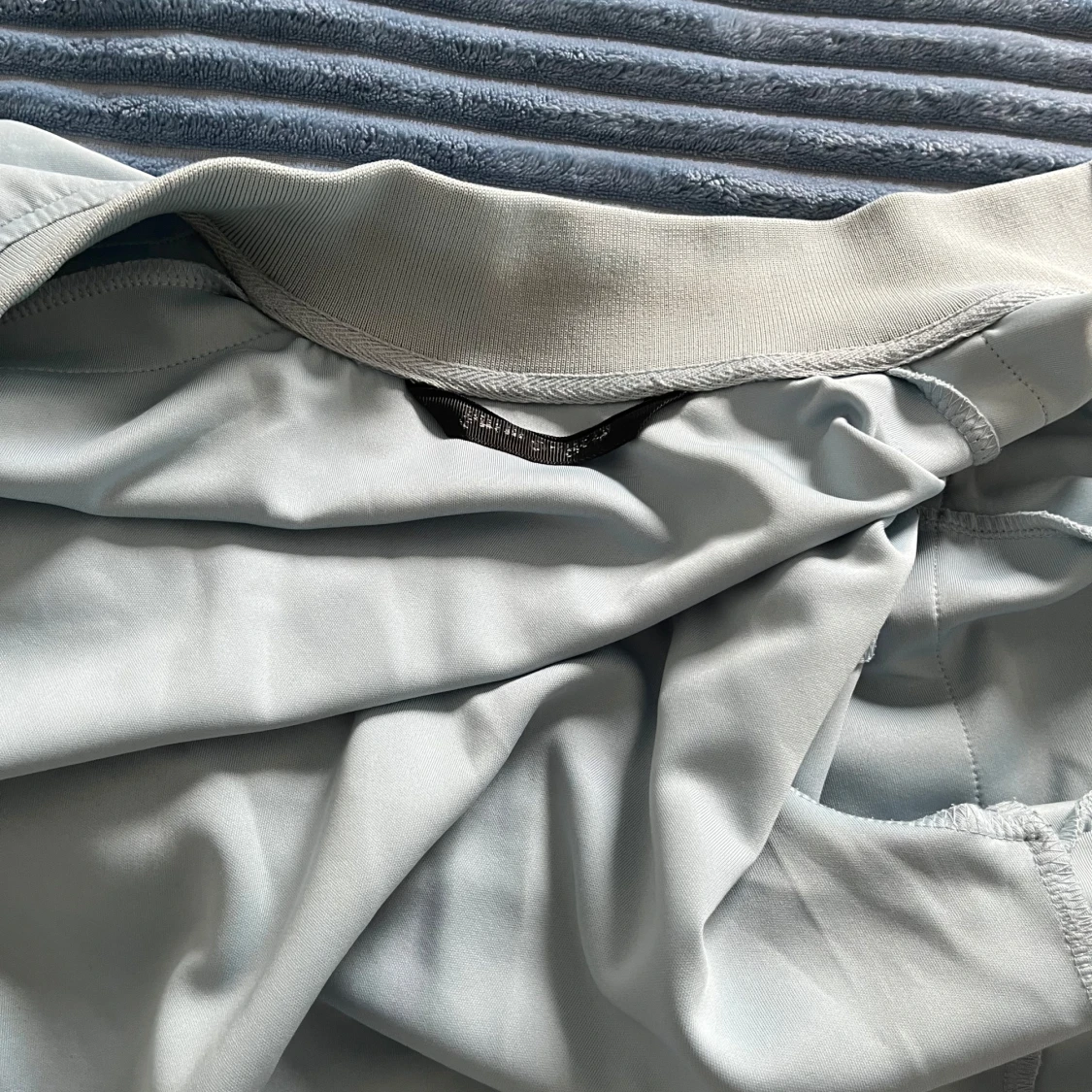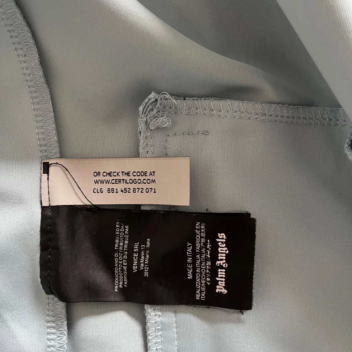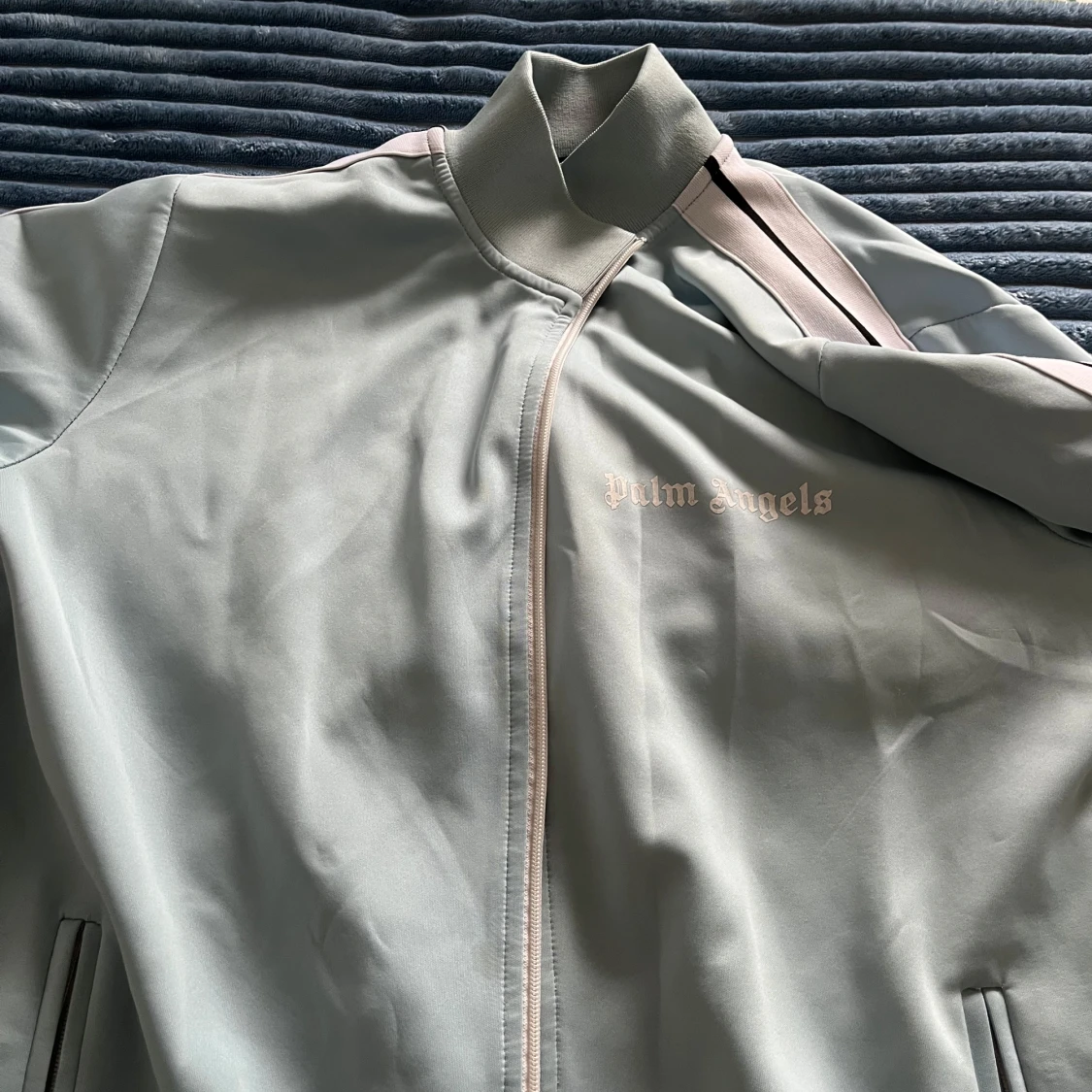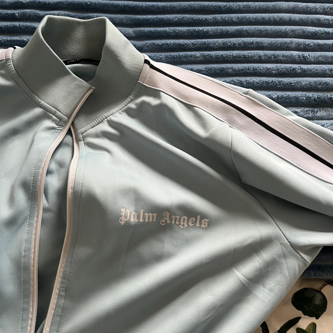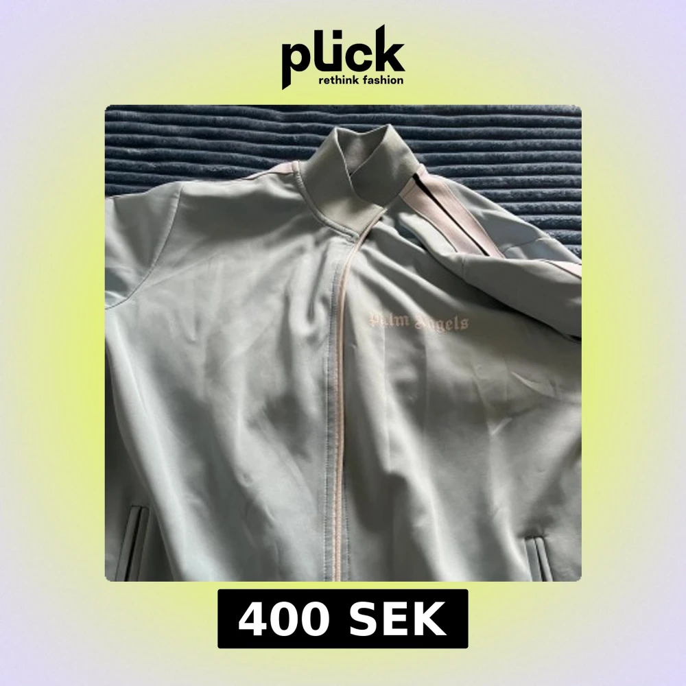 Säljer en ljusblå vindjacka från Palm Angels med dragkedja framtill och vita ränder med svart detalj längs ärmarna. Jackan har hög krage och broderad logga på bröstet. Perfekt för dig som gillar streetwear och snygga detaljer.