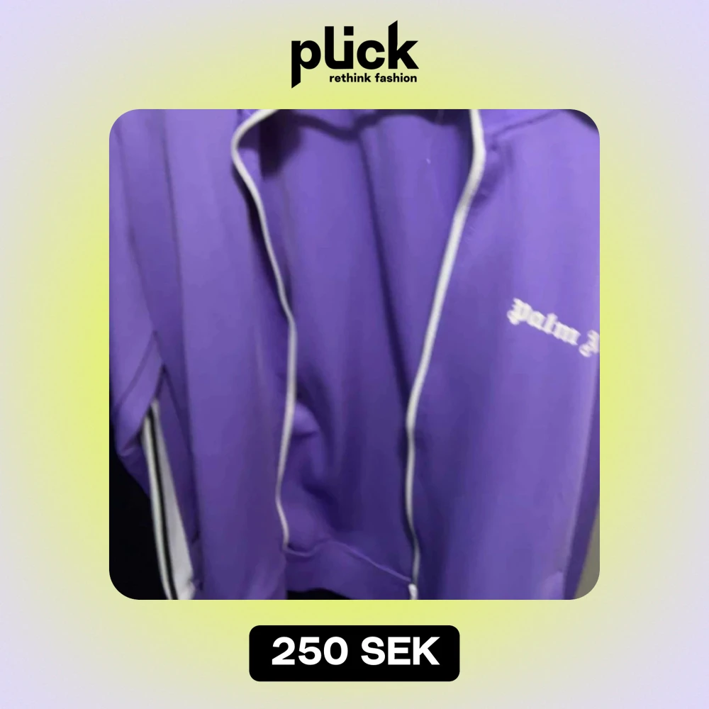 Säljer en snygg lila jacka från Palm Angels. Den har en dragkedja framtill och vita detaljer längs ärmarna. Perfekt för en cool och avslappnad stil. Passar både till vardags och fest!