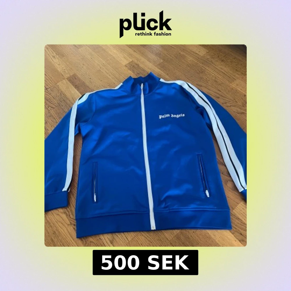 Snygg blå track jacket från Palm Angels med vita ränder längs ärmarna och vit dragkedja. Jackan har hög krage, två fickor med dragkedja och logga på bröstet. Perfekt för en sportig och trendig look.