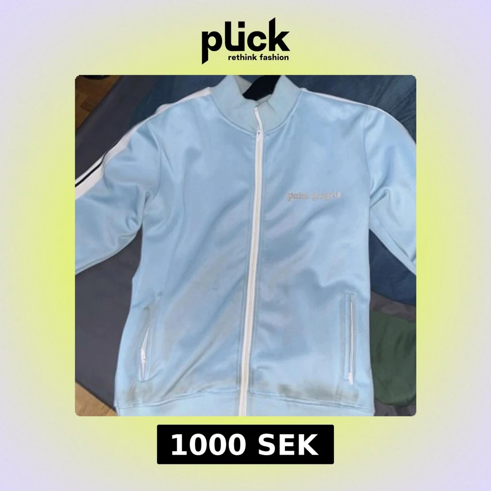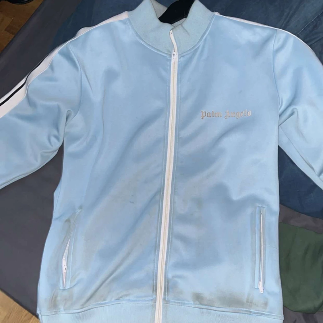 Snygg ljusblå track jacket från Palm Angels med vita detaljer och dragkedja. Jackan har långa ärmar och en sportig look med vita ränder längs ärmarna. Perfekt för en avslappnad stil.