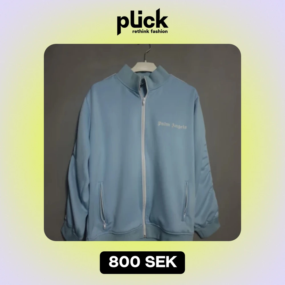Säljer en snygg ljusblå jacka från Palm Angels. Den har en dragkedja framtill och två fickor med dragkedjor. Jackan är långärmad och har en stilren design med Palm Angels-loggan på bröstet. Perfekt för en cool och avslappnad stil!