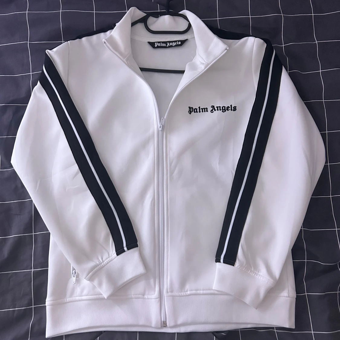 Säljer en stilren vit track jacket från Palm Angels med svarta ränder längs ärmarna. Jackan har dragkedja framtill och en broderad logga på bröstet. Perfekt för en sportig look!