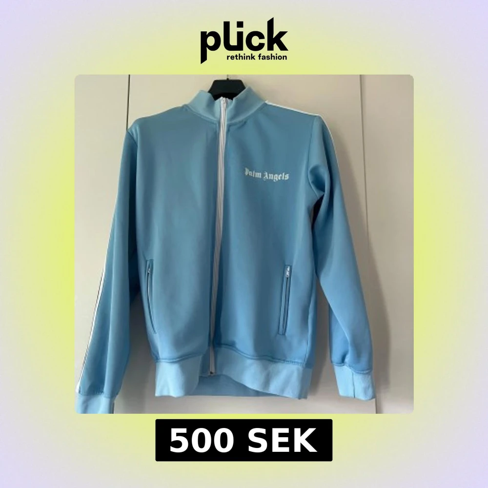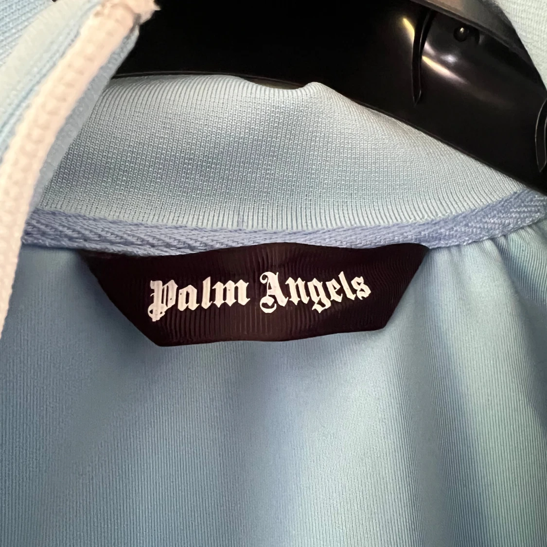 Säljer en ljusblå track jacket från Palm Angels med vit dragkedja och logga på bröstet. Jackan har ståkrage, två fickor med dragkedja och ribbade muddar. Perfekt för en sportig och trendig look. Pris kan diskuteras vid snabb affär