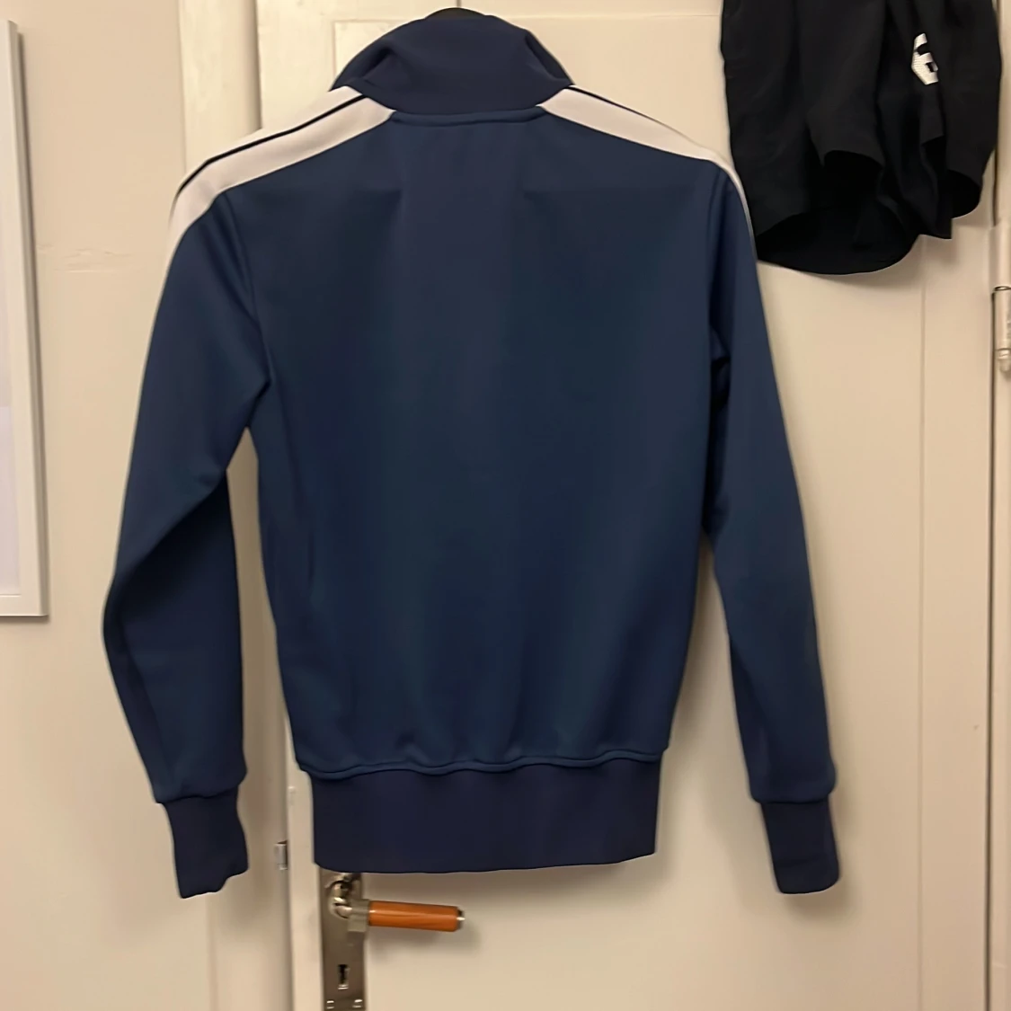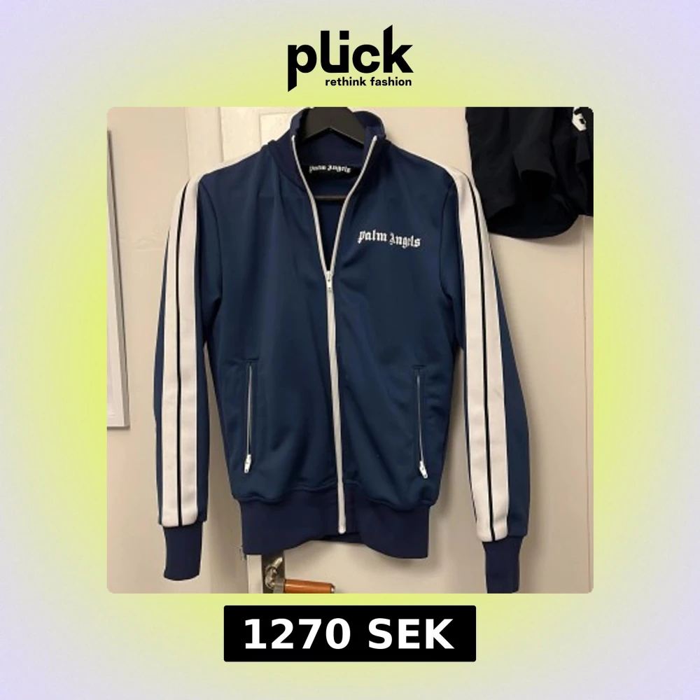 Snygg blå track jacket från Palm Angels med vita ränder längs ärmarna och vit dragkedja. Jackan har hög krage, två fickor med dragkedja och logga på bröstet. Perfekt för en sportig och trendig look.