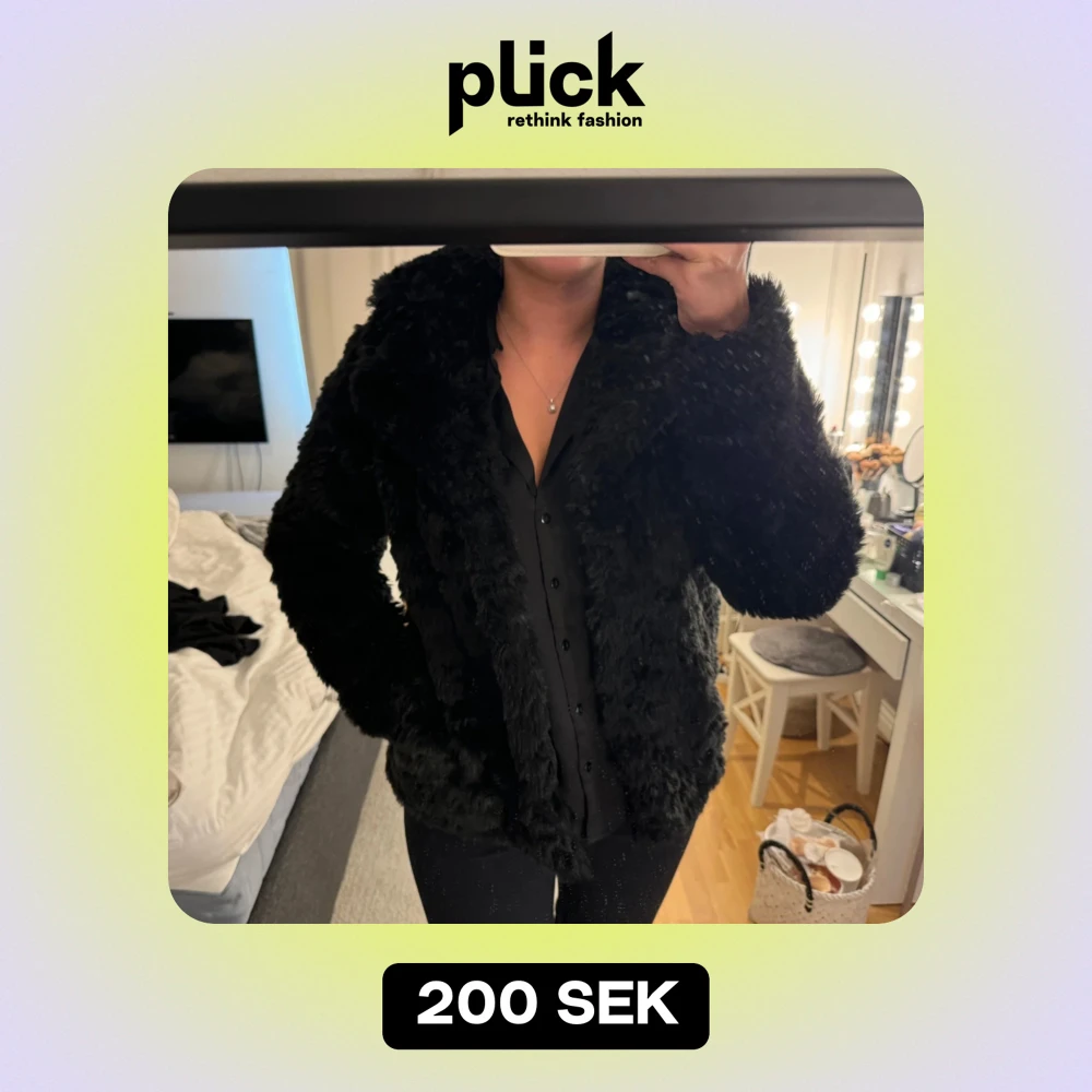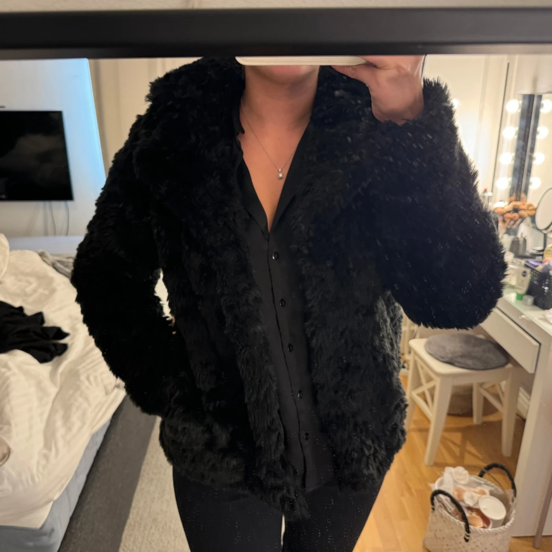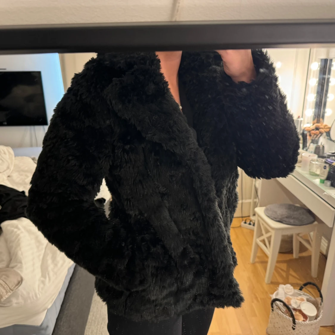 Svart pälsjacka med fickor, perfekt till vintern. Storlek S-M