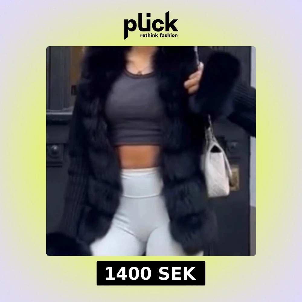 Säljer en svart pälskappa med bred krage och stora fluffiga detaljer vid ärmslut och längs framkanten. Västen har en lyxig look och är perfekt för att höja din outfit. Materialet är päls och stickad textil, och modellen är loose fit med öppen front.
