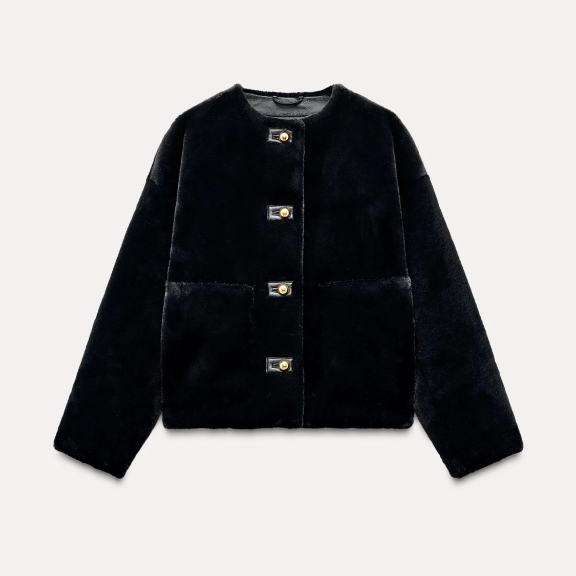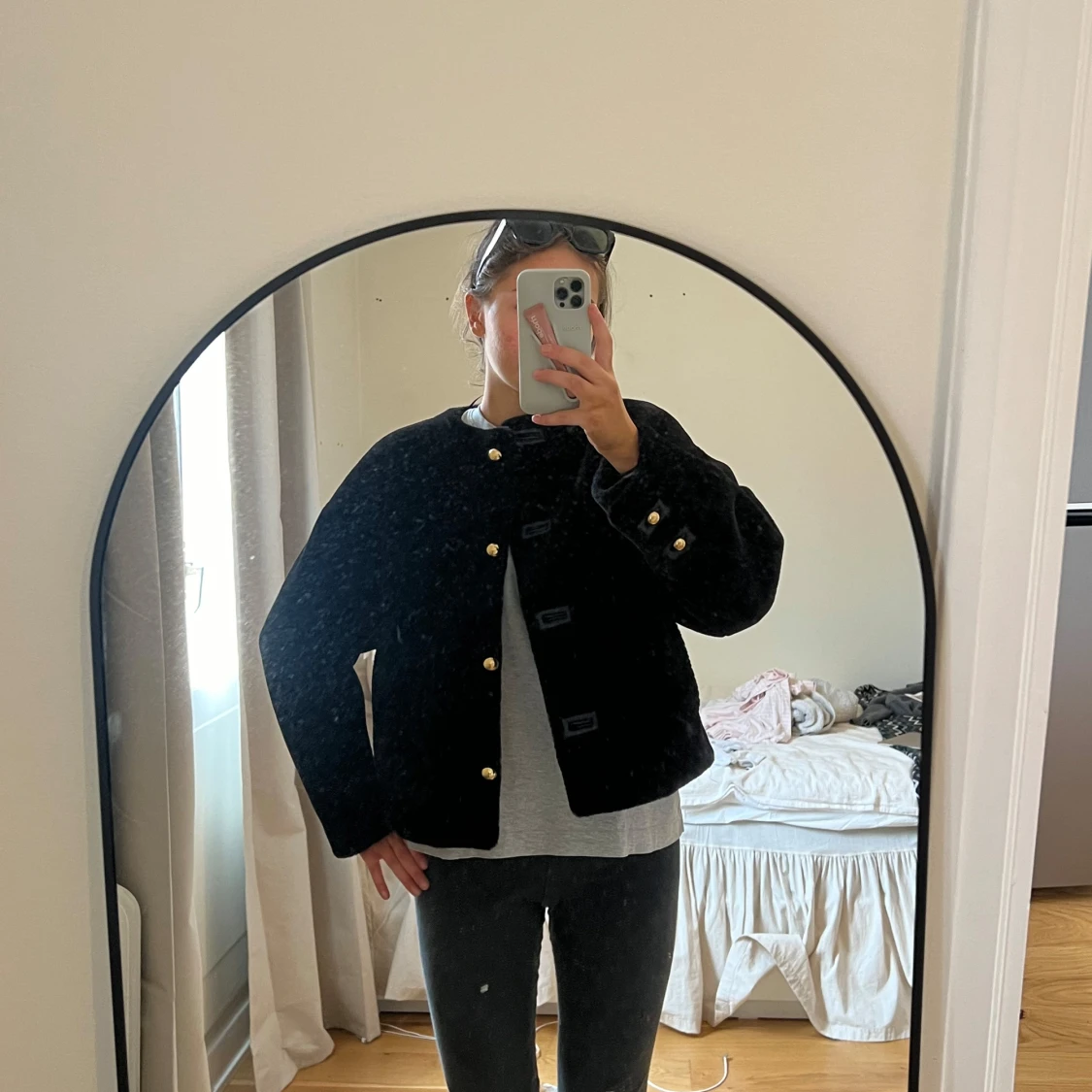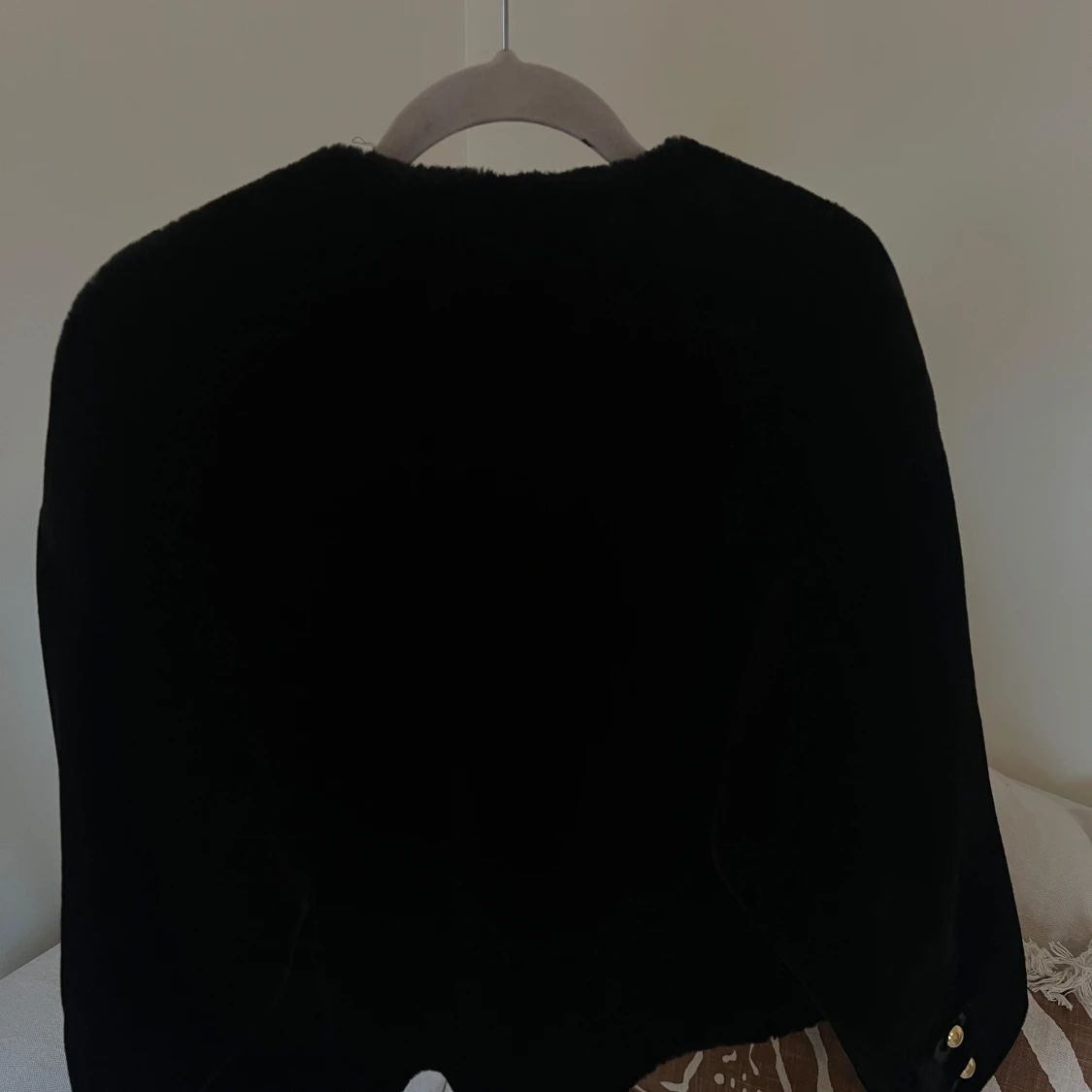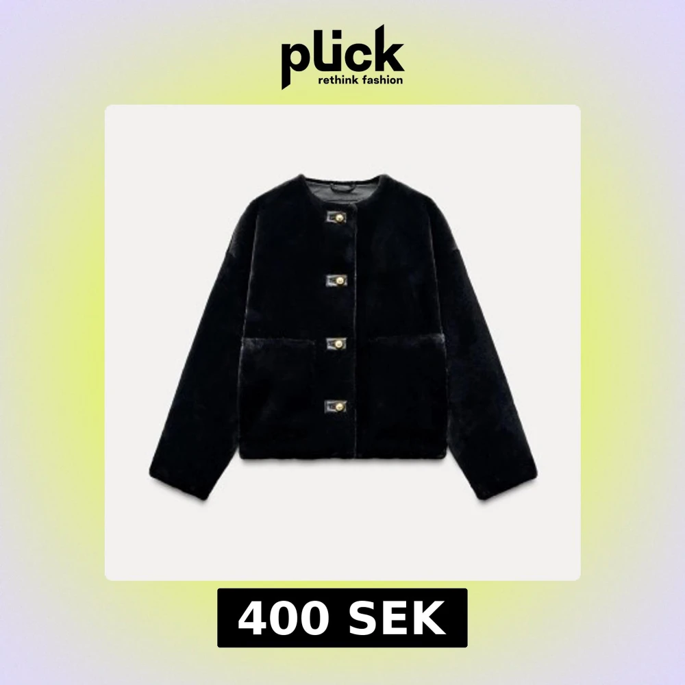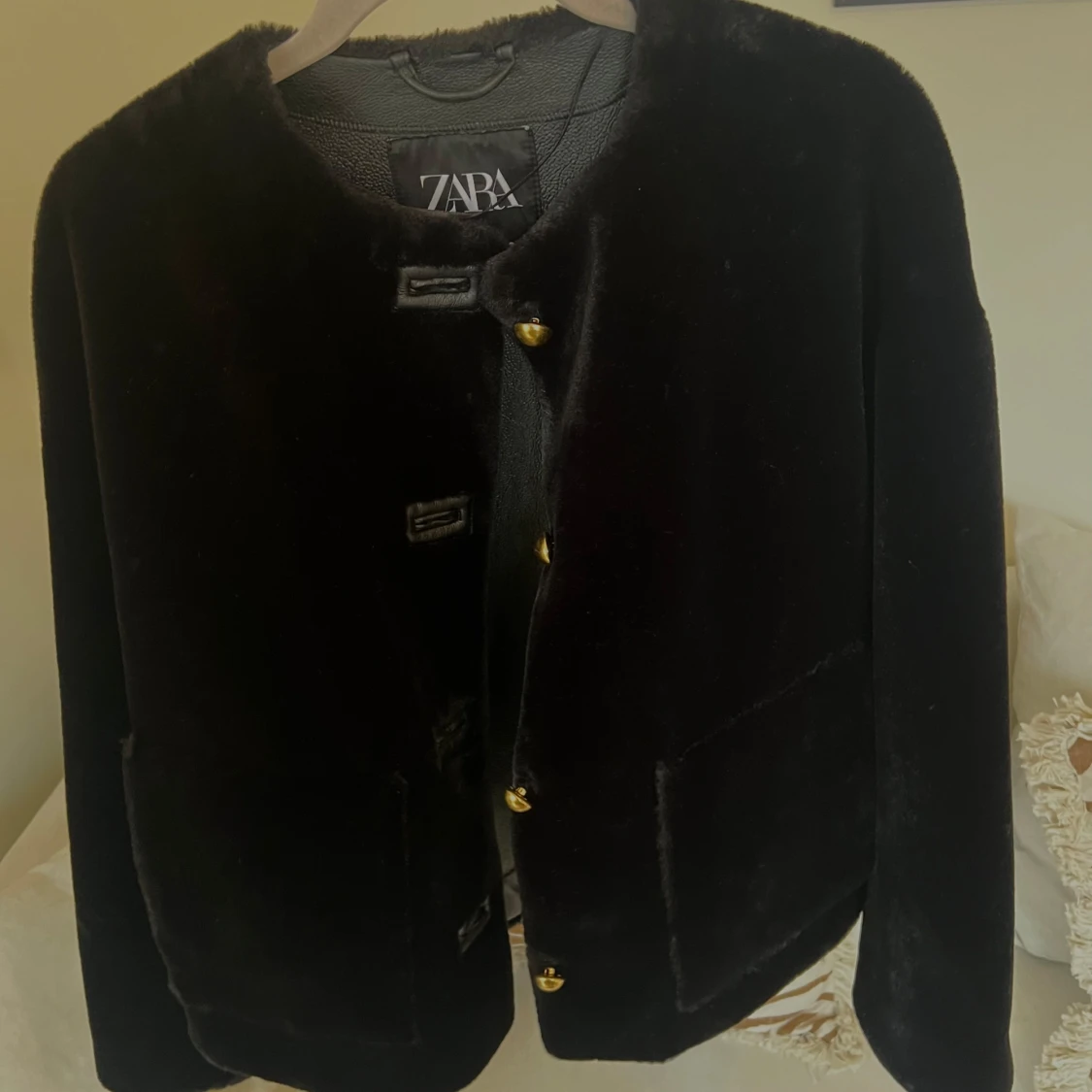 Säljer en svart pälsjacka från Zara med snygga guldknappar framtill. Jackan har rund halsringning, två stora fickor med skinnimitation inuti.