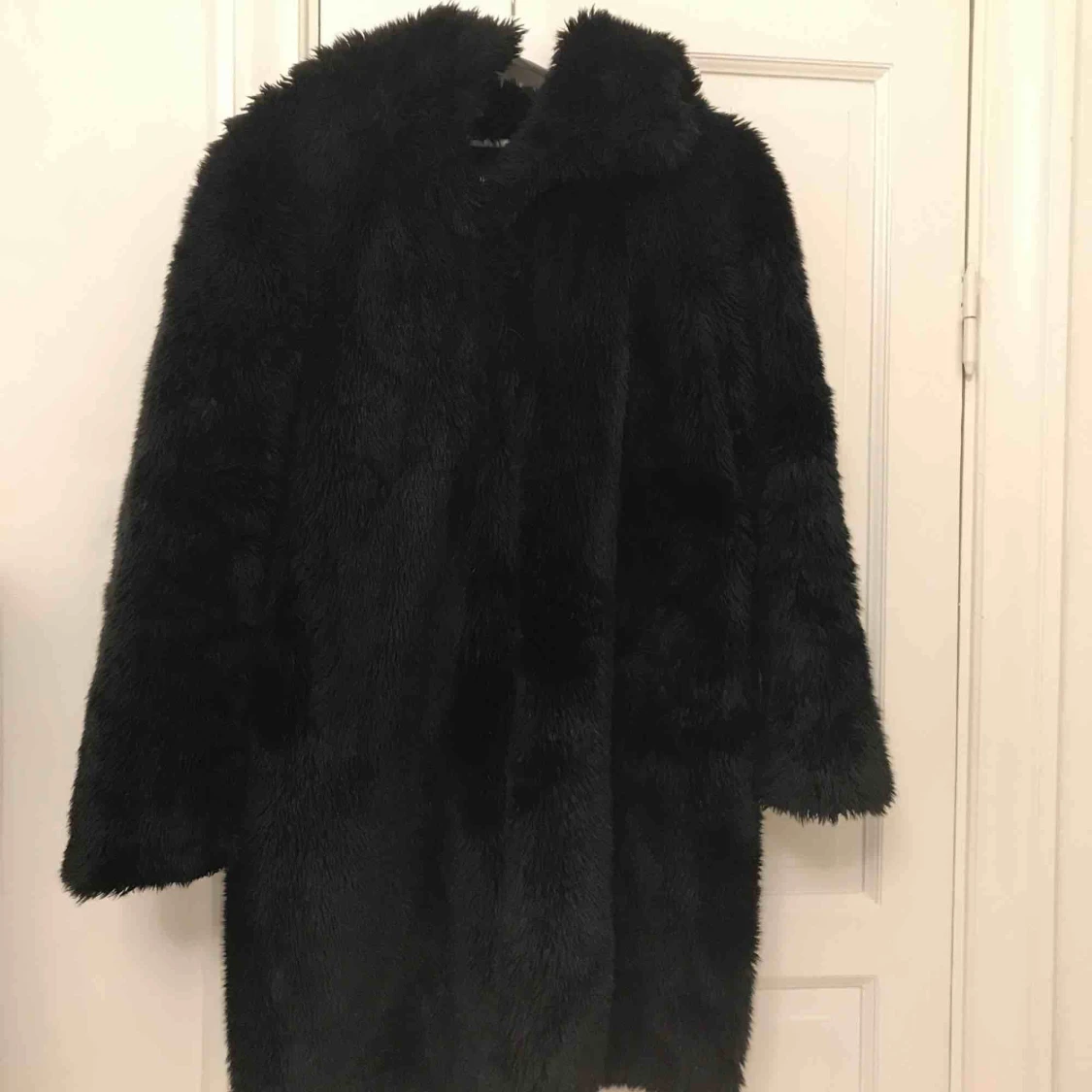 Varm, lång fuskpälsjacka från Monki. Flera år gammal och väl använd!