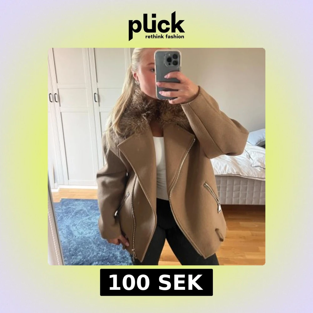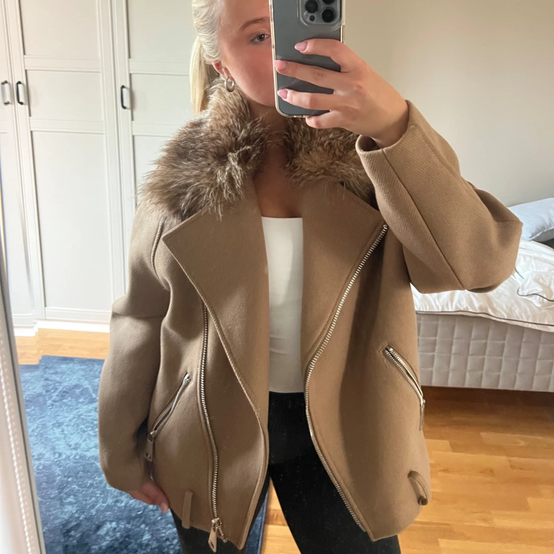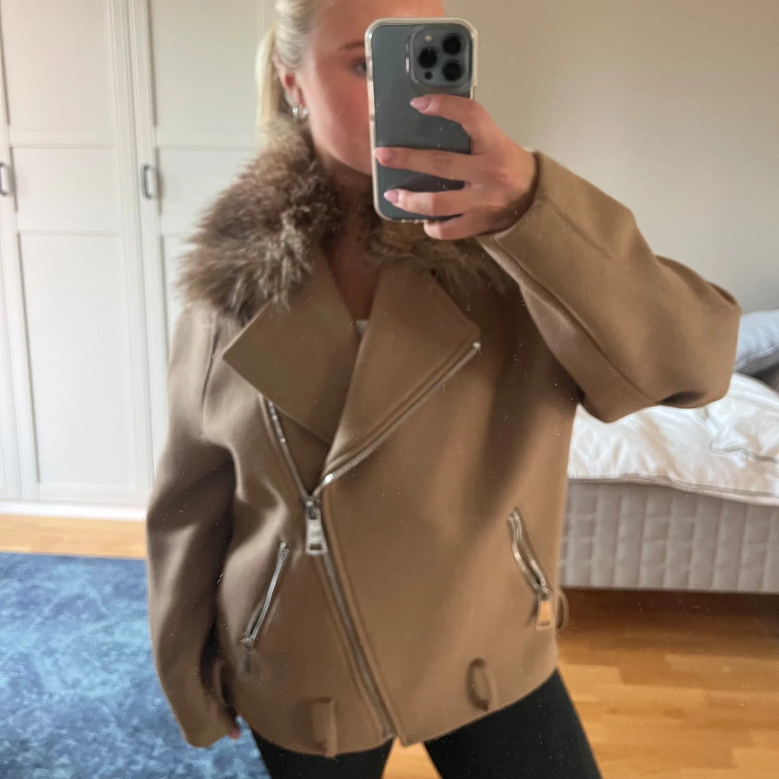 Snygg beige jacka med bred krage i fuskpäls och coola silvriga dragkedjor framtill. Jackan har en loose passform och stora slag, perfekt för dig som gillar statement-plagg. Materialet känns tjockt och mjukt, och pälsdetaljen ger extra edge till looken. Det ska finnas ett band längst ner som tyvärr är borta men använt jacka ändå och man tänker inte på det