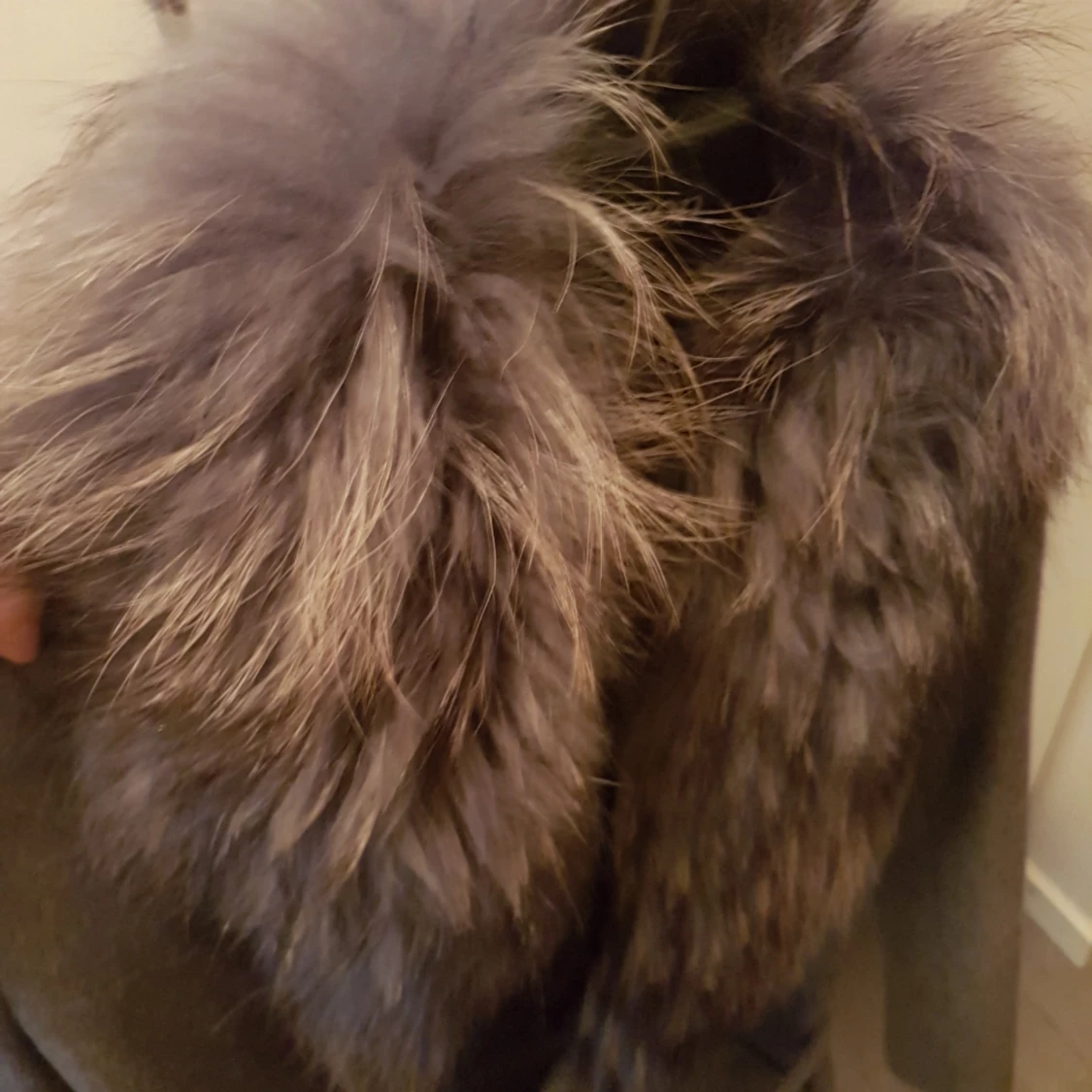 Grå kappa med äkta pälskrage i storlek small. Finns på Södermalm (endast avhämtning skickas ej)