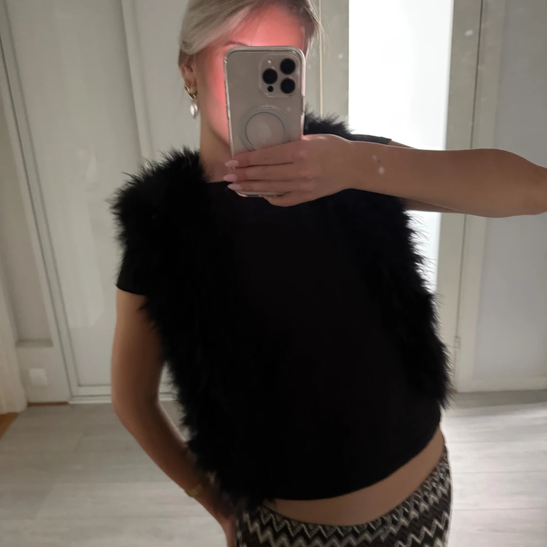 Säljer en svart pälsväst i storlek M med fluffig och mjuk känsla. Västen har en klassisk rak passform och är helsvart utan synliga detaljer eller mönster. Perfekt för att addera lite edge till din outfit.
