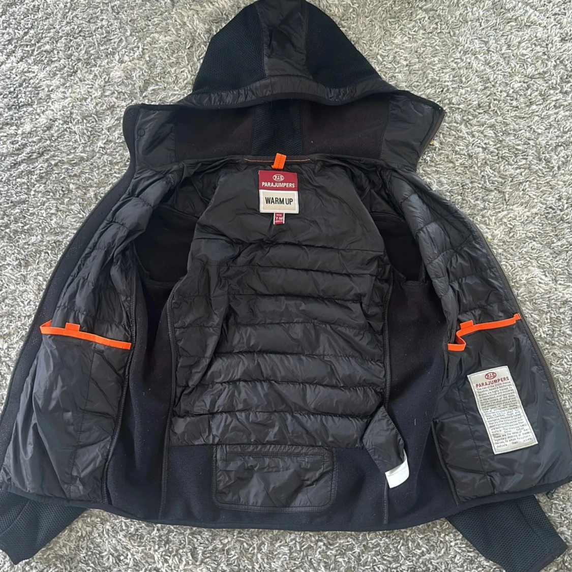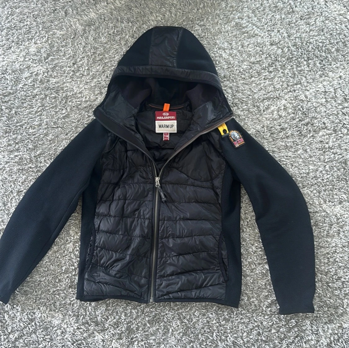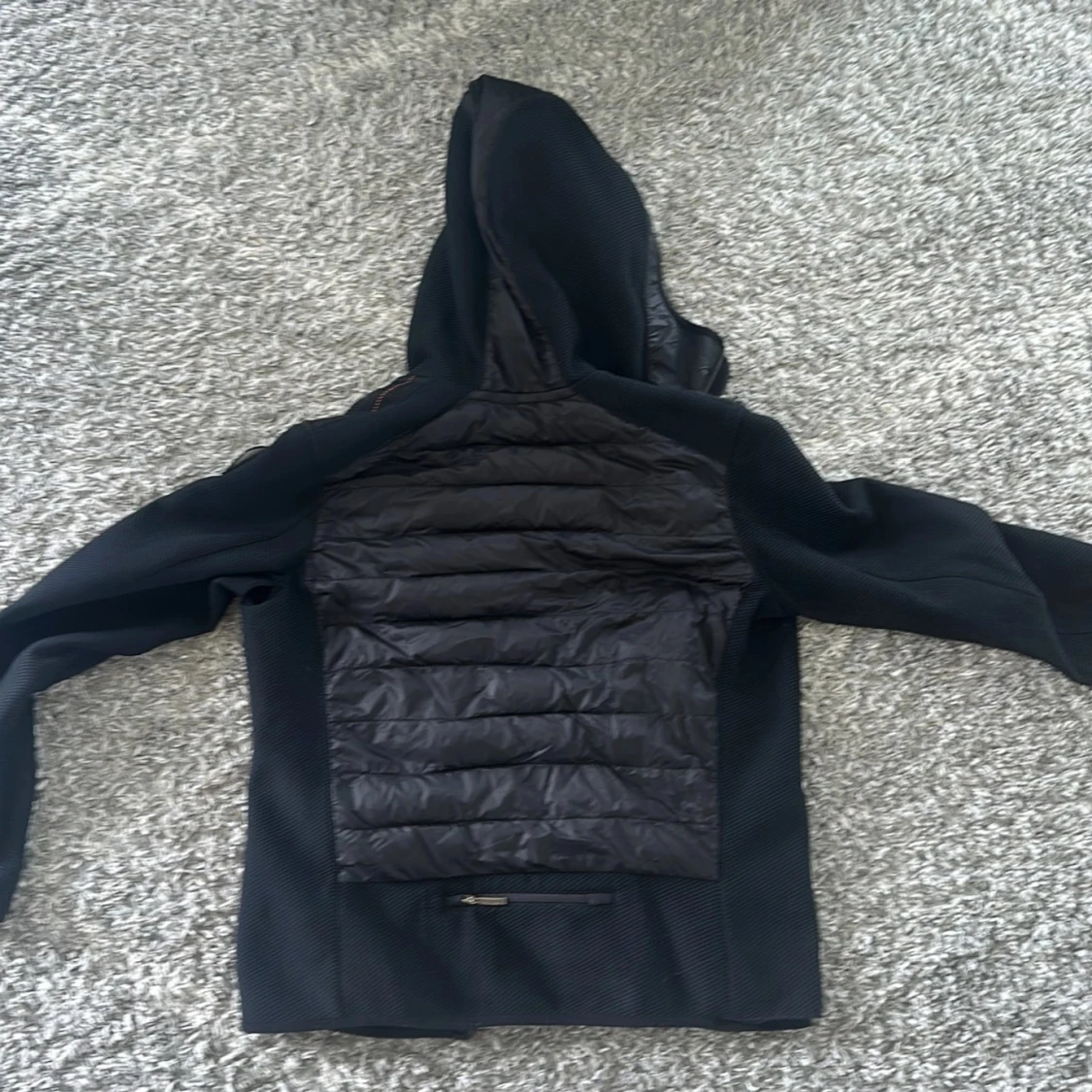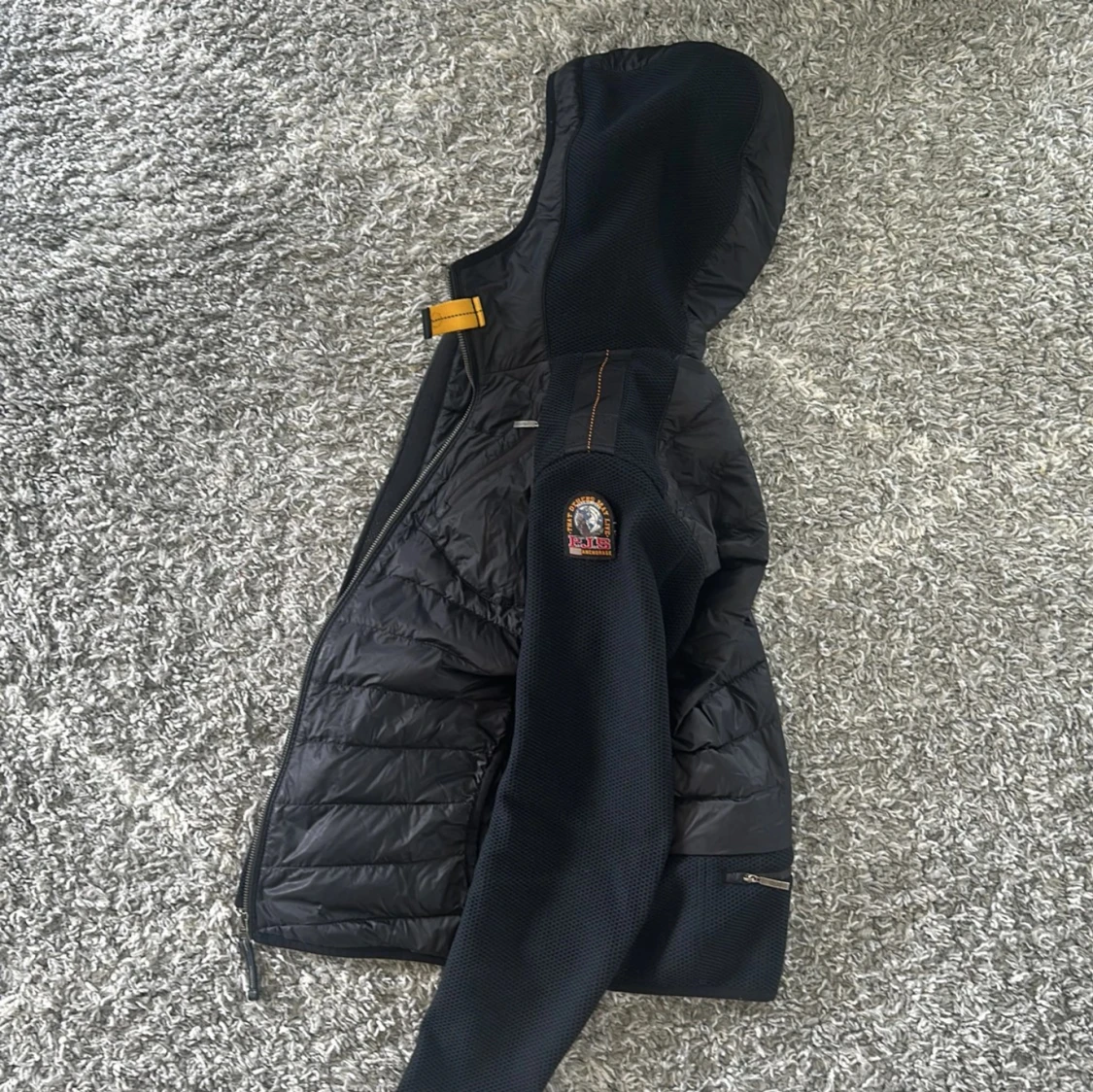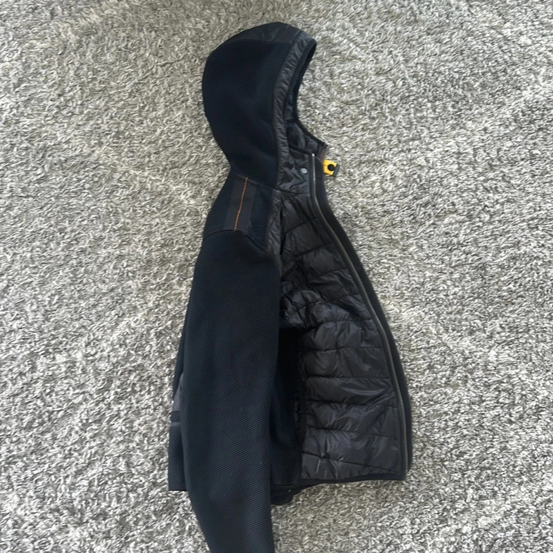 Svart cardigan från Parajumpers med huva, quiltad front och släta ärmar. Cardiganen är extremt bekväm att bära i lite kyligare väder som till exempel på hösten och våren. Knappt använd, Y-M. Ny pris 4500kr, mitt 2500kr. Priset ej hugget i sten så kom med ett prisförslag.