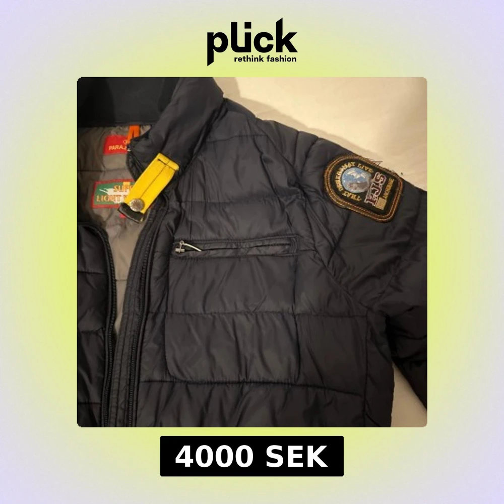 Säljer en svart quiltad jacka från Parajumpers med en broderad patch på ärmen. Jackan har en dragkedja framtill och en bröstficka med dragkedja. Den är superlätt och perfekt för kyligare dagar.