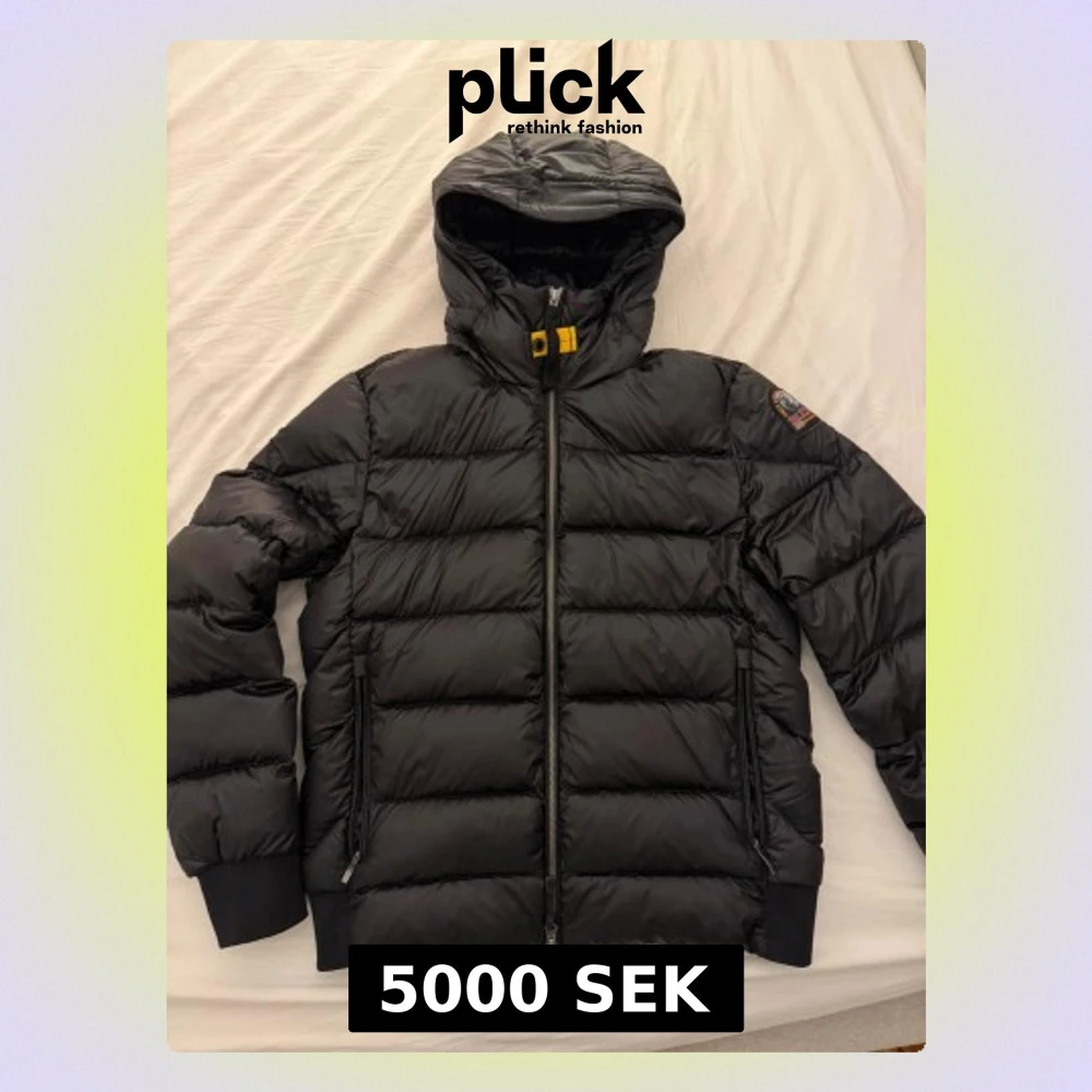 Svart dunjacka från Parajumpers, modell pharrell, med huva och gul detalj vid halsen. Jackan har quiltad design, dragkedja framtill och två fickor med dragkedja. Klassisk patch på armen och insida i ljusgrått. Kvitto finns, köpt från urban modern