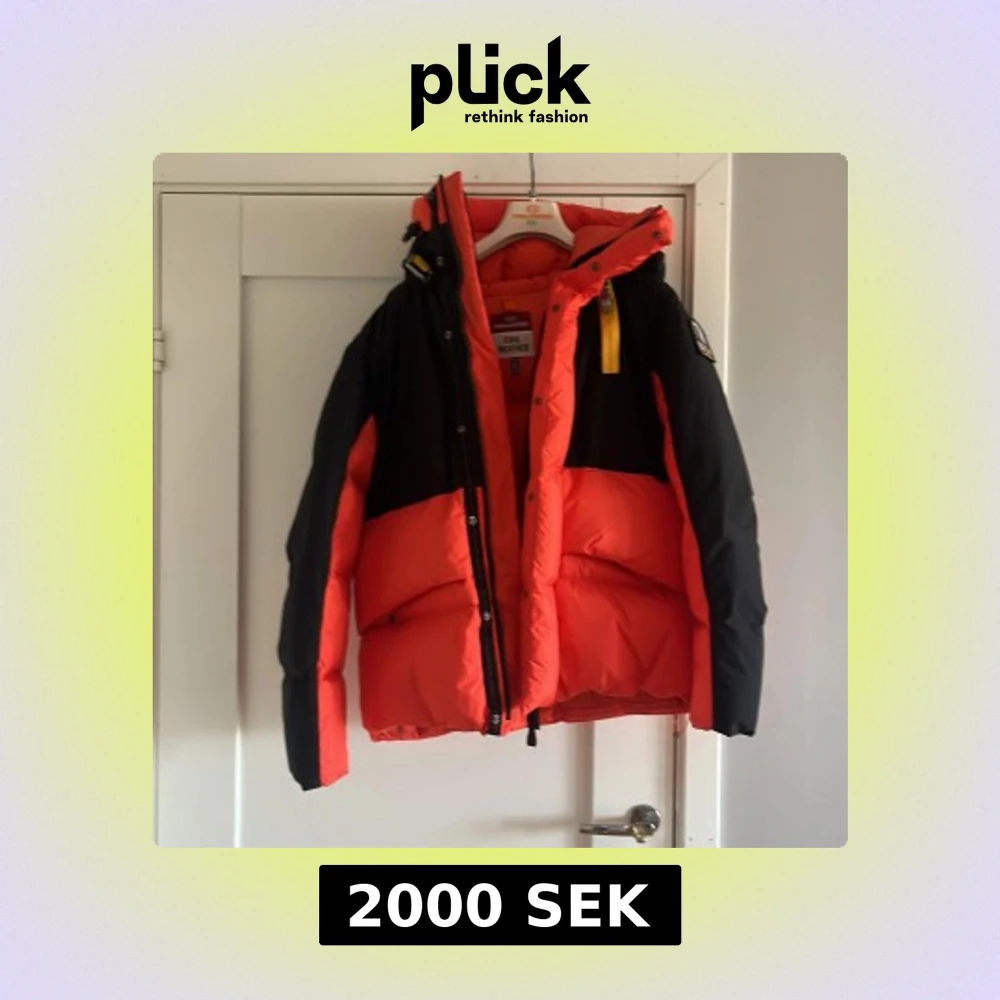Orange parajumperjacka! Storlek S passar M också! Använd några hånger utan märken dock lite nertill innuti jackan pga av att man kan dra åt den! Skriv vid intresse!