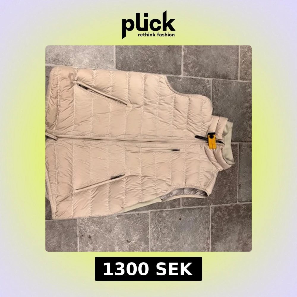 Snygg beige quiltad dunväst från Parajumpers med dragkedja och två snedställda fickor framtill. Västen har en hög krage och klassisk Parajumpers-detalj vid halsen. Inga skador på västen. Mvh