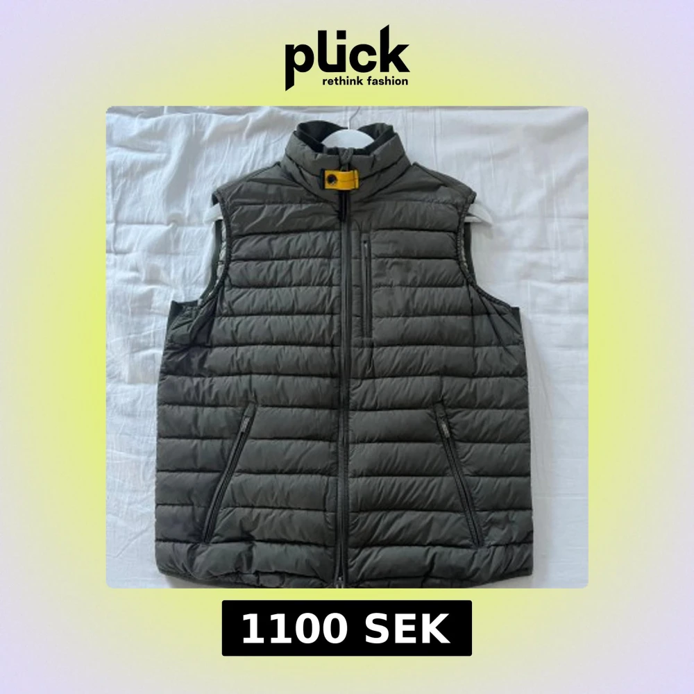Säljer en snygg grå dunväst från Parajumpers. Västen har en dragkedja framtill och en hög krage med en gul detalj. Perfekt för kyligare dagar och ger en stilren look. Den är i mycket bra skick förutom några mindre fläckar som knappt syns se bild 2