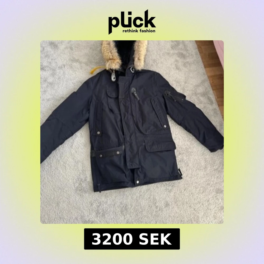 Svart parkajacka från Parajumpers med päls. Patch på ärmen och avtagbar huva med päls. Jackan har flera fickor, dragkedja och knappar framtill samt quiltat foder. Perfekt för kalla dagar och riktigt snygg. Varm och vattentät. Toppskick