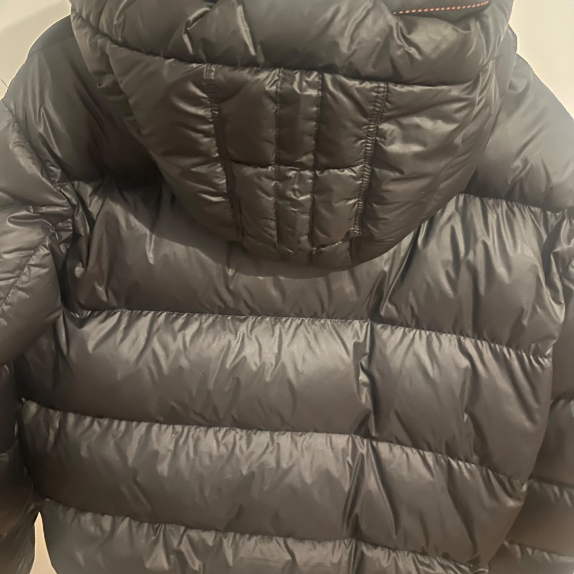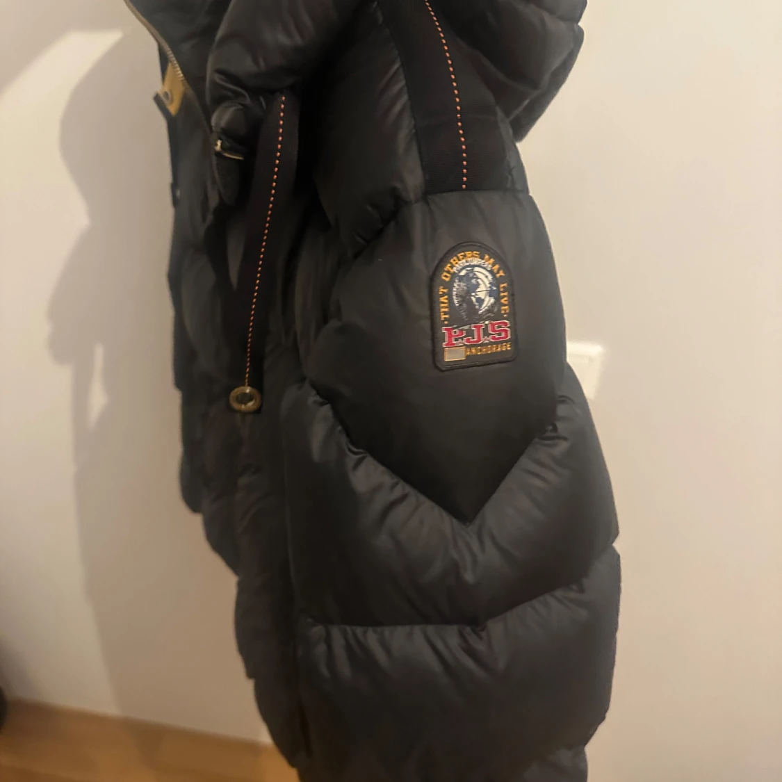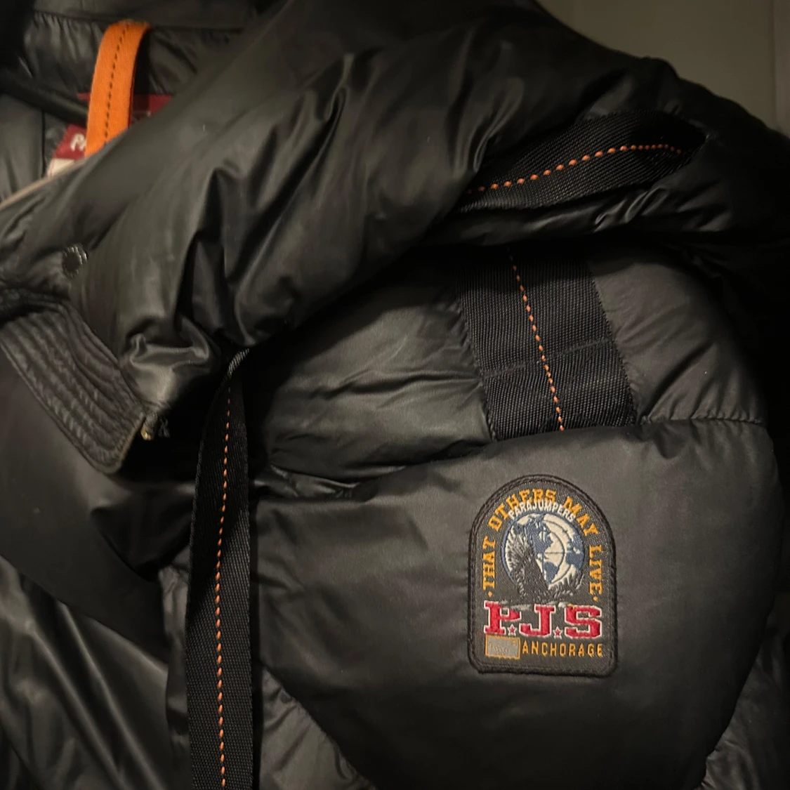 Säljer en svart dunjacka från Parajumpers, modell Hollywood. Jackan har snygga detaljer med orange och gula inslag, patch på ärmen och dragkedja framtill. Fodret är grått och materialet känns slitstarkt och varmt, perfekt för kalla dagar. Priset går att diskutera