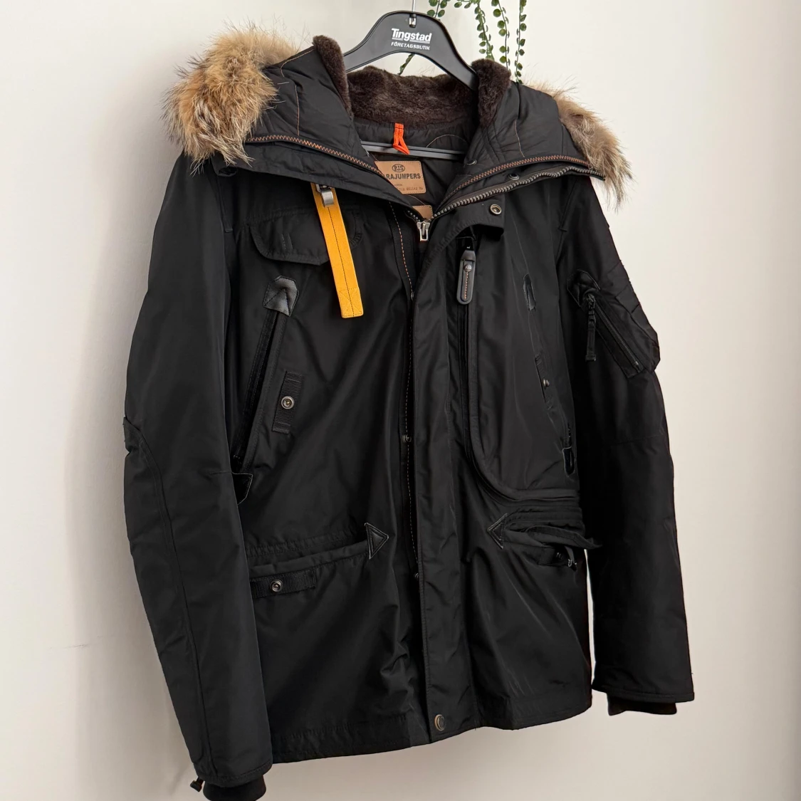 Grym svart vinterjacka från Parajumpers med stor huva och snygg pälsdetalj. Jackan har flera fickor, dragkedja och coola detaljer som gul rem och patch på ärmen. Perfekt för kalla dagar och riktigt stilren look. Äkthetsbevis finns! Mycket bra skick! Mer bilder finns privat! Avtagbar päls!